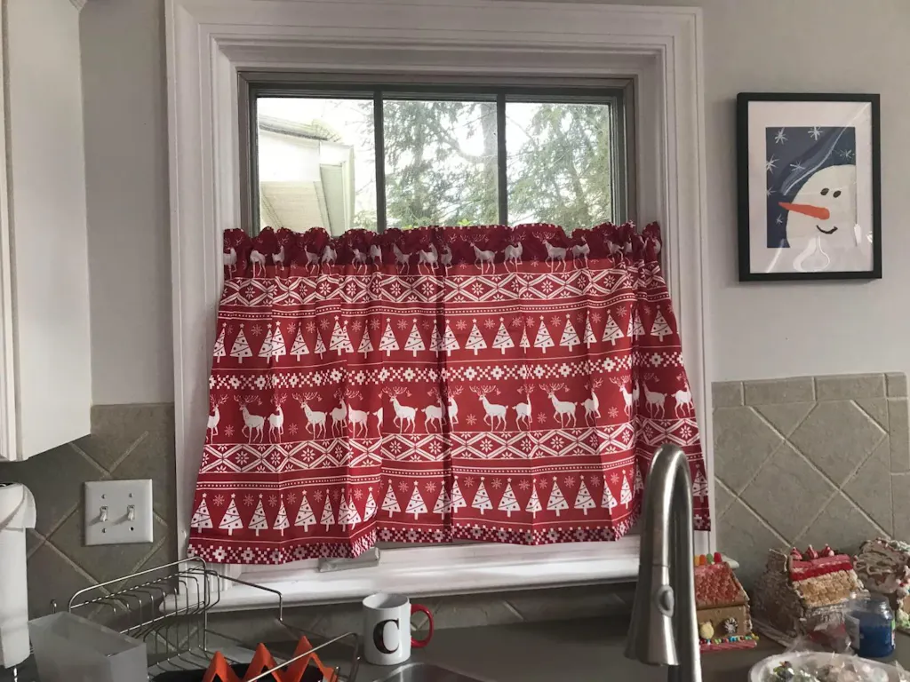 - Package include: Set of 2 panels of snowflake Christmas kitchen tier curtains with the size of 26" Width x 36" Length. Top rod pocket design with 2" inner diameter, fit most rods in the market, slides easily onto your curtain rod for quick hanging. and pull very smooth while opening and closing.