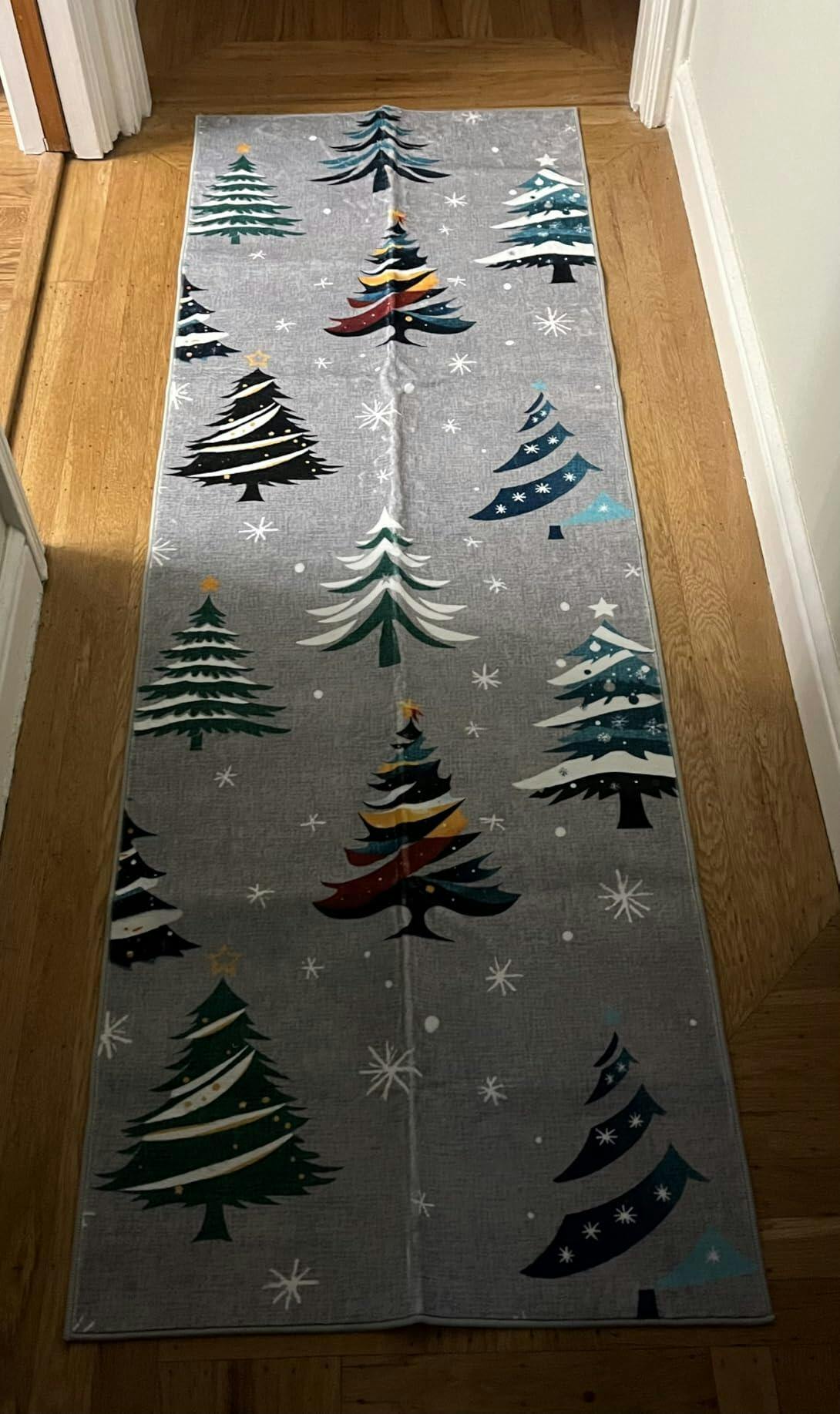 This area rug fits in perfectly with my holiday decorations. It’s colorful and very festive. The rug is soft under your feet, it’s just the right amid thickness. The best part is it adheres to the floor so there’s no movement and is slip resistant. Just remember to open it as soon as you receive it. It helps with getting the folds out from shipping.