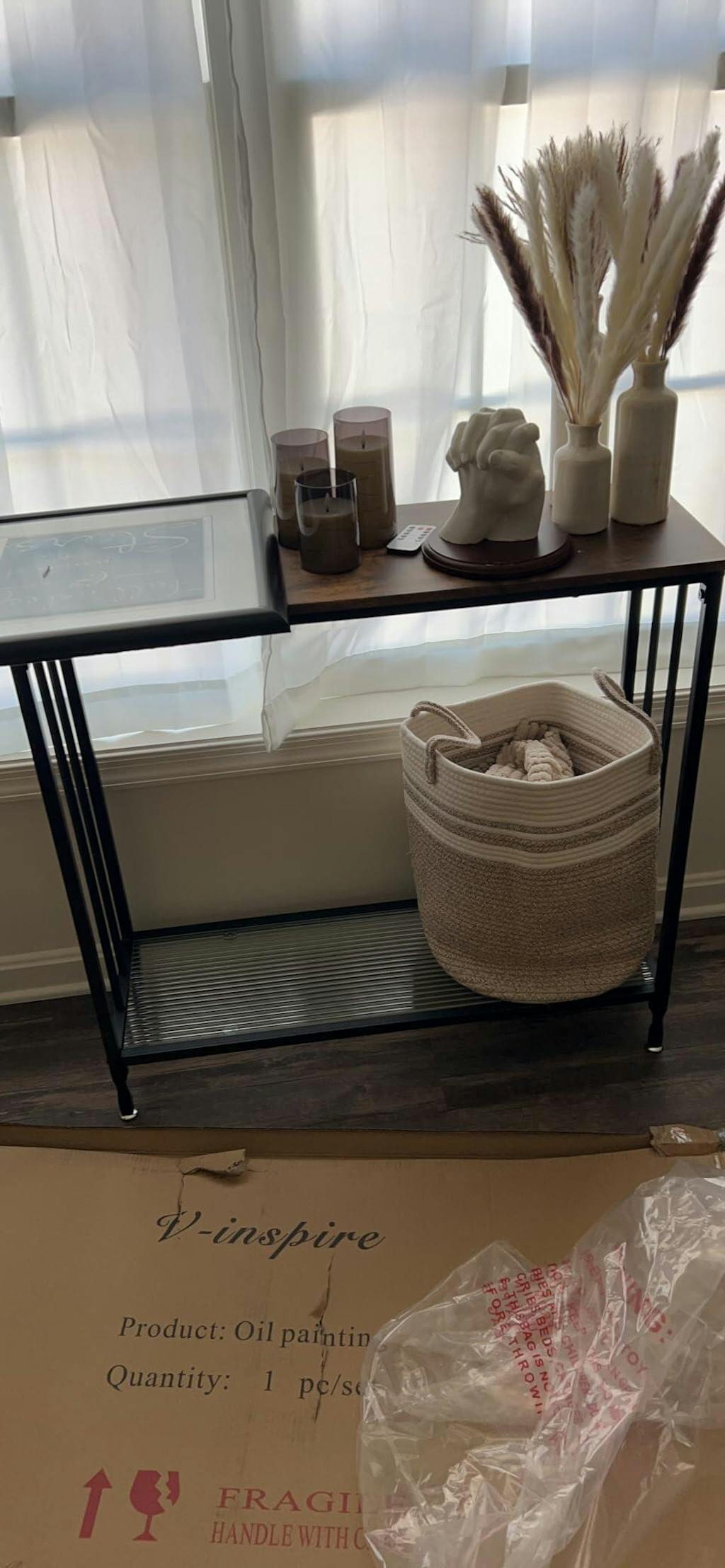 With its vintage wood grain finish and sleek metal frame, this console table combines classic charm with modern design. The open shelf provides ample storage space for your everyday essentials.