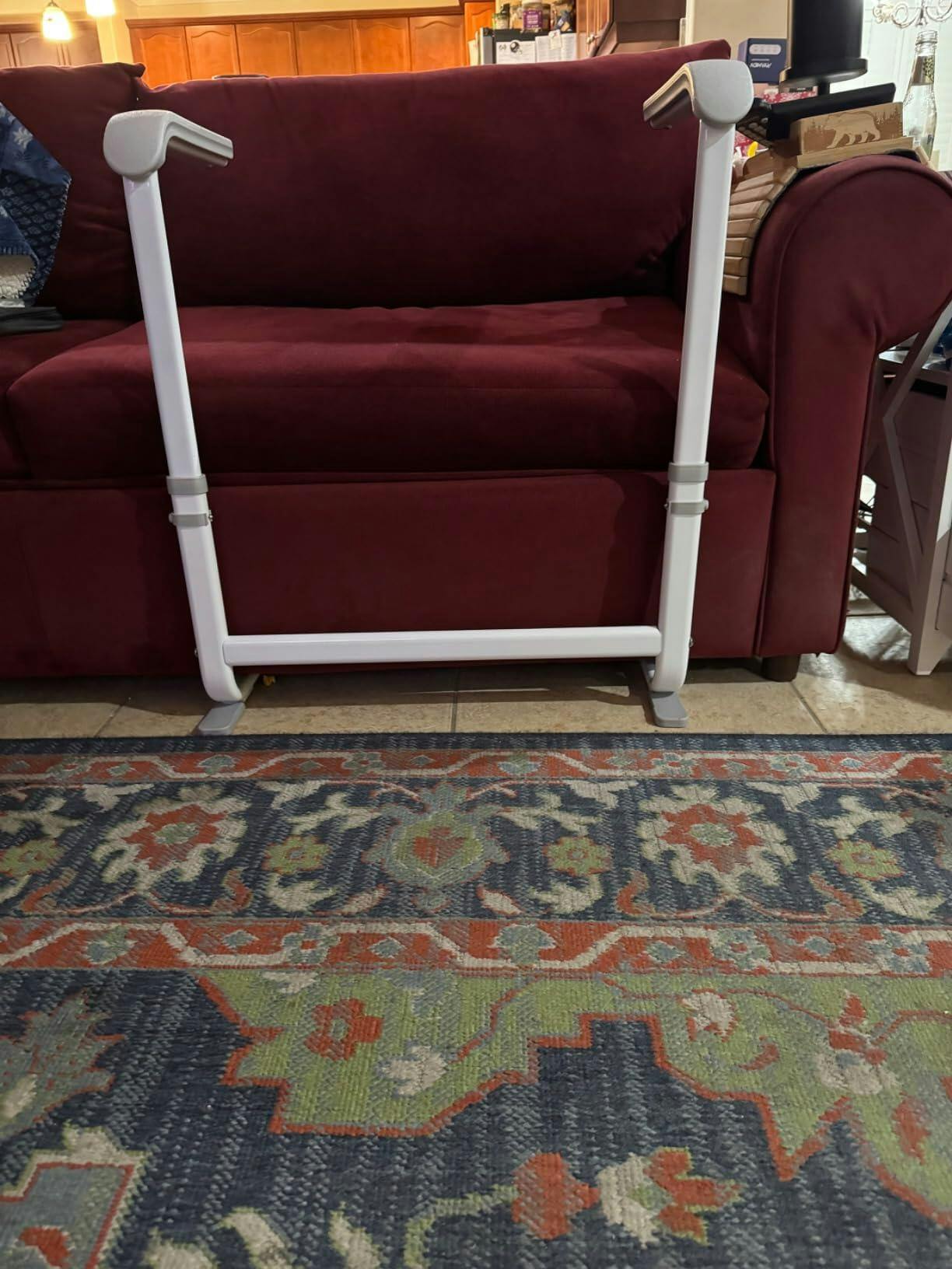 This Chair Couch Stand Assist came in 4 pieces which were easy to assemble. The item is sturdy metal and the finish is nice with rounded contours and smooth paint. There are rubber pads on the bottom piece. The width is set at about 22.5” between the armrests but the height is adjustable. It slides easily and unobtrusively under a couch or chair. It is surprisingly solid and has a balanced weight to it so it does provide good stability and leverage to aid a person when they are sitting or standing up.
