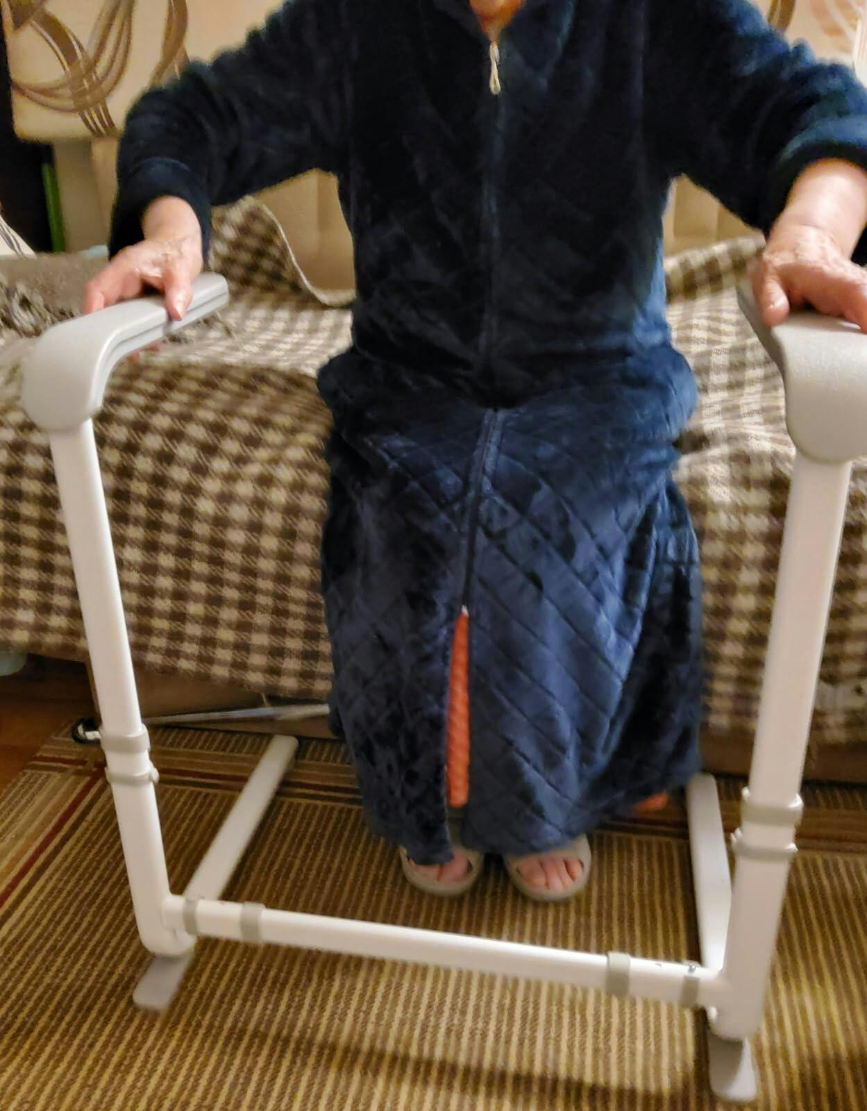 When ordering this device, we were concerned about whether it would be suitable for our apartment, where the sofa and bed are positioned directly on the floor with no gap. However, our fears proved to be unfounded; this device works well even without a gap, allowing for smooth movement, as shown in the photo. This device comes beautifully packaged in a semi-assembled state. The box contains five main components of this structure, and your only task is to connect them according to the instructions. Assembly is quick and easy. True, after assembling the structure, the armrests wobble slightly, and the wobble increases with the height at which the armrests are installed. But this is not critical. The color of the stand is always WHITE! You can choose the color of the device's armrests, which are available in either gray or brown. Adjusting the device to the desired width and height is straightforward and well-documented in the instructions supplied with it. The rubber feet are very grippy; they do not slide on my linoleum or carpet. The device is highly functional, and every older adult, even those who do not yet require such support, should consider purchasing it and keeping it in their apartment.