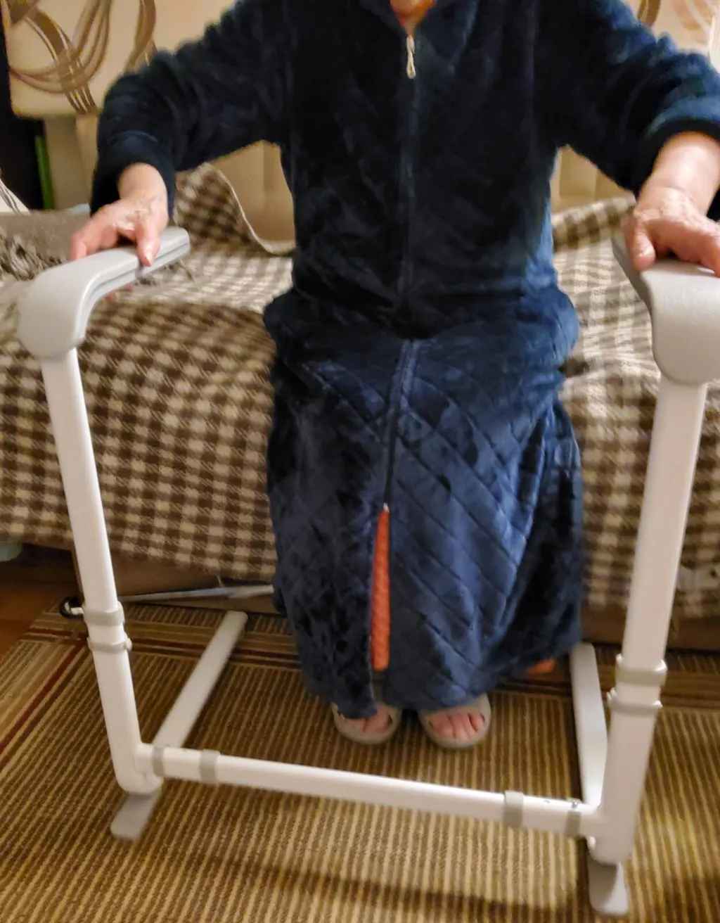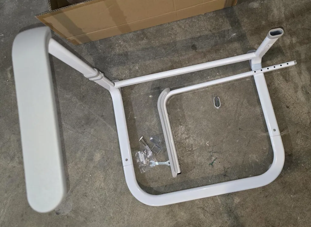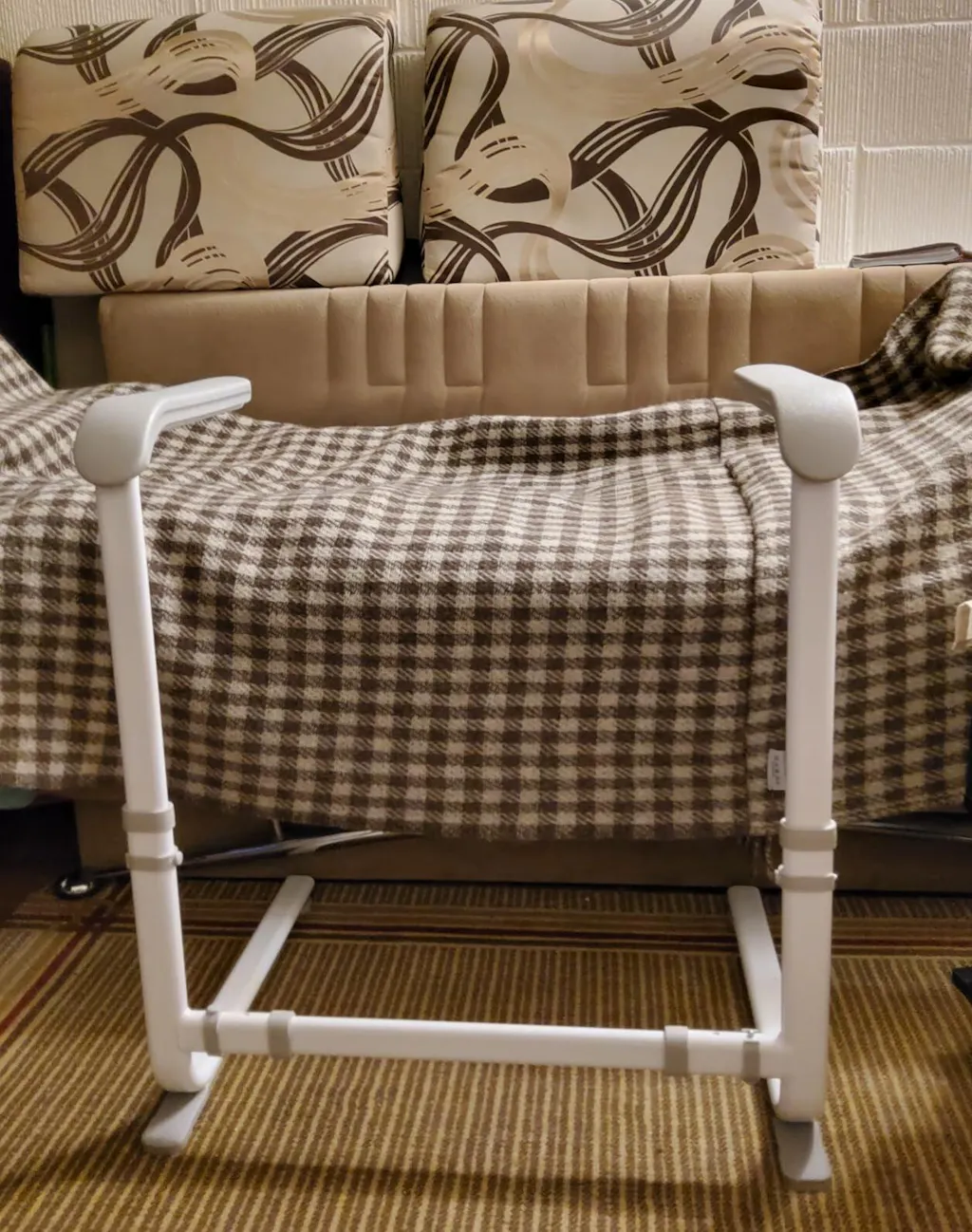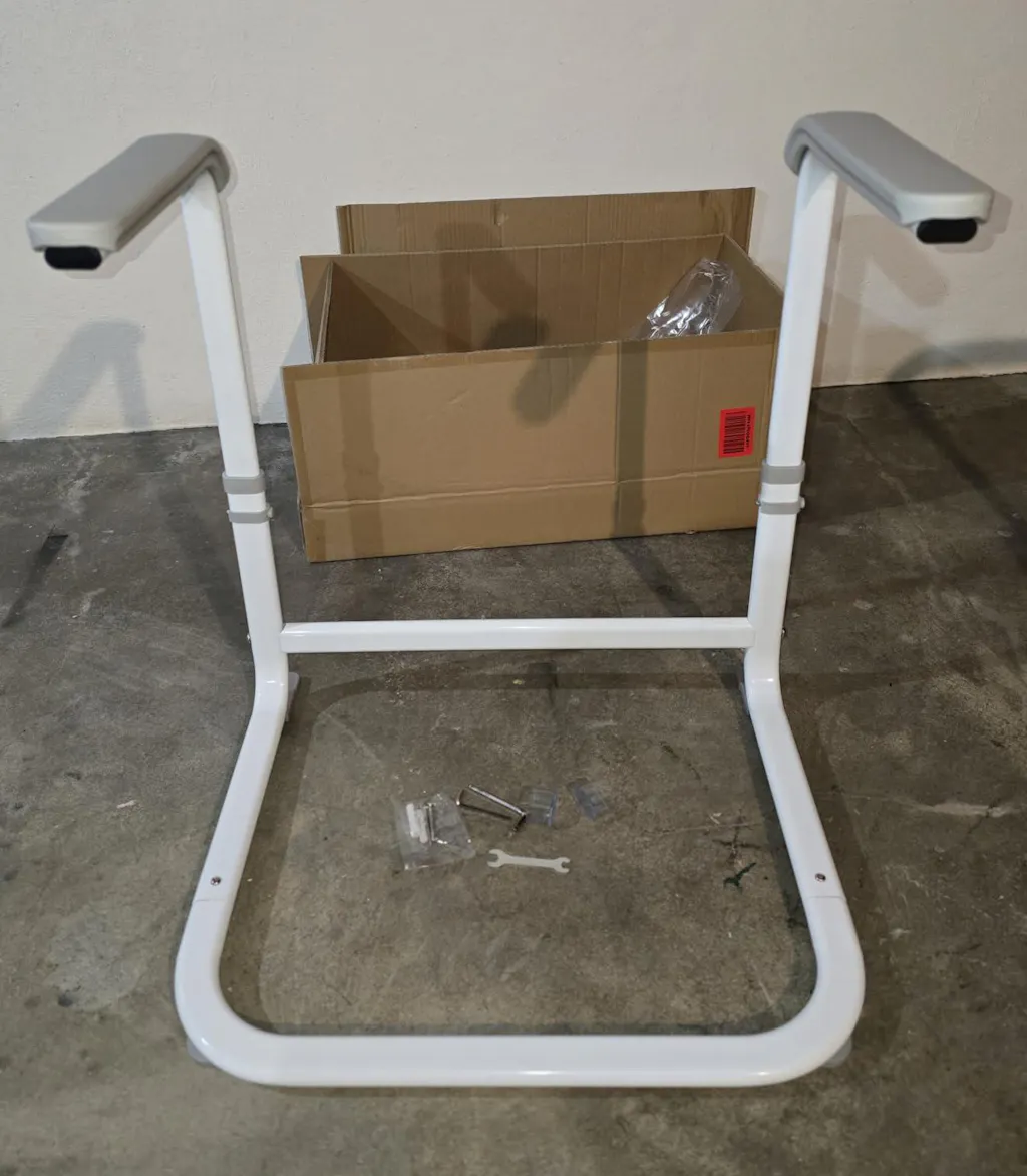 When ordering this device, we were concerned about whether it would be suitable for our apartment, where the sofa and bed are positioned directly on the floor with no gap. However, our fears proved to be unfounded; this device works well even without a gap, allowing for smooth movement, as shown in the photo. This device comes beautifully packaged in a semi-assembled state. The box contains five main components of this structure, and your only task is to connect them according to the instructions. Assembly is quick and easy. True, after assembling the structure, the armrests wobble slightly, and the wobble increases with the height at which the armrests are installed. But this is not critical. The color of the stand is always WHITE! You can choose the color of the device's armrests, which are available in either gray or brown. Adjusting the device to the desired width and height is straightforward and well-documented in the instructions supplied with it. The rubber feet are very grippy; they do not slide on my linoleum or carpet. The device is highly functional, and every older adult, even those who do not yet require such support, should consider purchasing it and keeping it in their apartment.