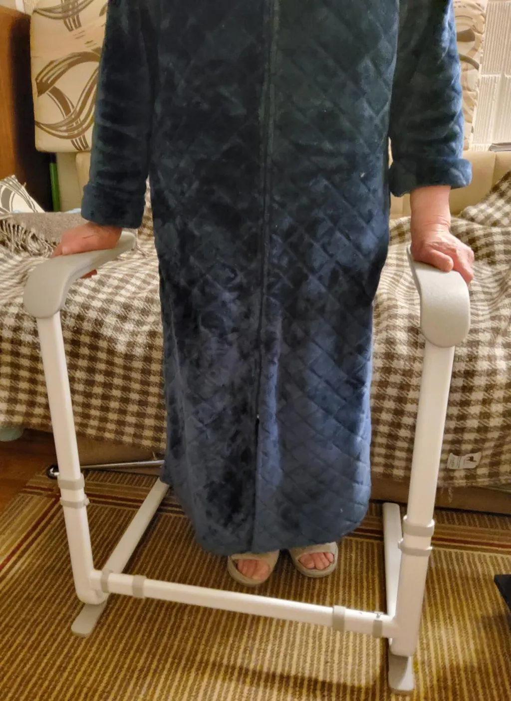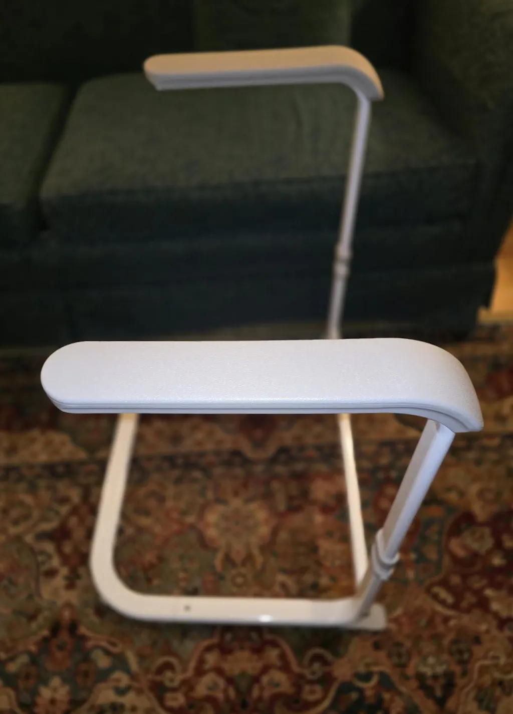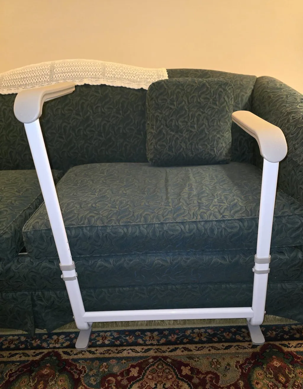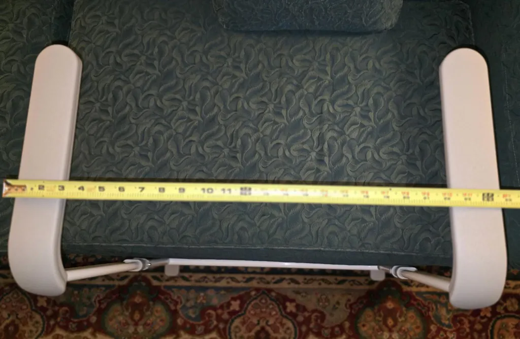 This Chair Couch Stand Assist came in 4 pieces which were easy to assemble. The item is sturdy metal and the finish is nice with rounded contours and smooth paint. There are rubber pads on the bottom piece. The width is set at about 22.5” between the armrests but the height is adjustable. It slides easily and unobtrusively under a couch or chair. It is surprisingly solid and has a balanced weight to it so it does provide good stability and leverage to aid a person when they are sitting or standing up.