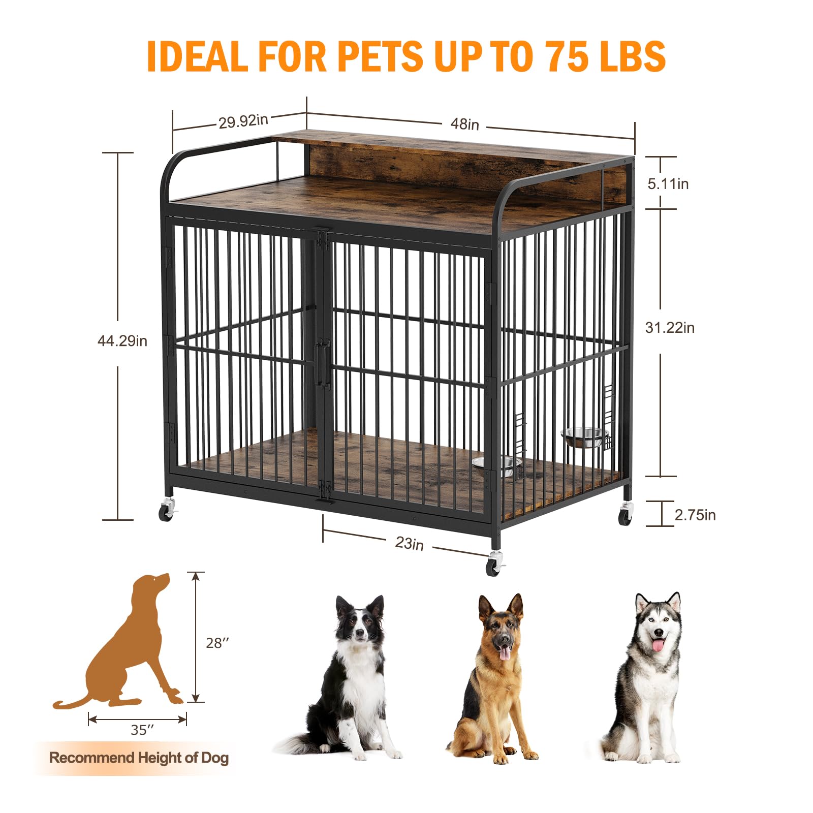 Garvee Wooden Dog Crate Furniture End Table with Adjustable Height & 360° Rotating Feeder, Heavy Duty Dog Crate with 360° Wheels, Dog Kennel Indoor, Medium