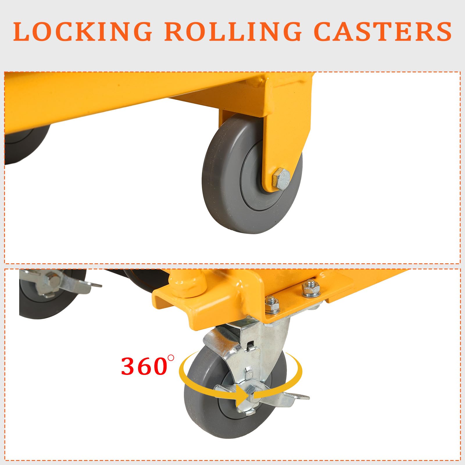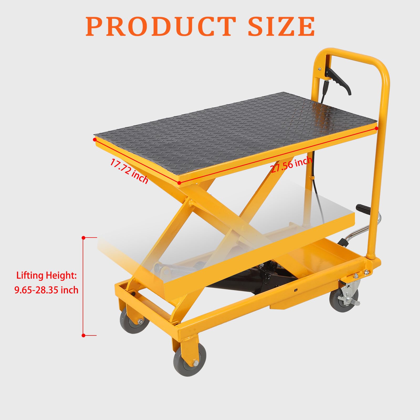 - EASY MOBILITY: The hydraulic lift table is fitted with PU swivel wheels that can be swivelled in multiple directions to ensure smooth and easy movement. A locking device holds the trolley firmly in place, preventing accidental movement during transport, easy to operate and low noise. Convenient for you to operate flexibly in narrow space and passageway. Widely used in factories, warehouses, express delivery, supermarkets, cold storage and other different occasions of material handling.
