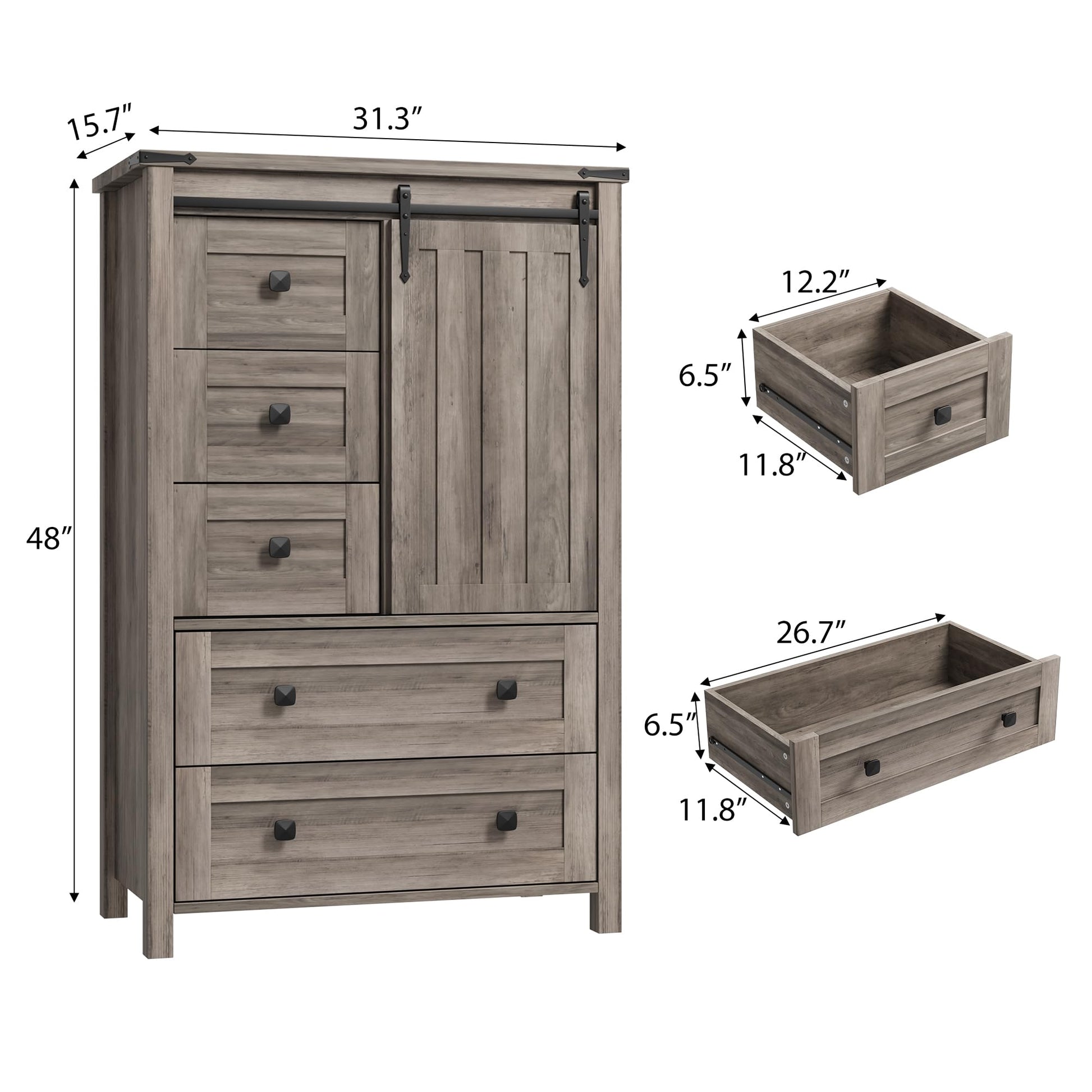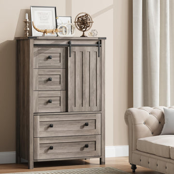 - 【Sliding Barn Door】 Compared to traditional drawer designs, the sliding door mechanism of this 5 drawer dresser requires less effort to operate and eliminates the risk of accidental drawer pull-out. This design is ideal for all users, especially the elderly and children with reduced hand strength.