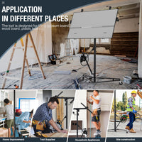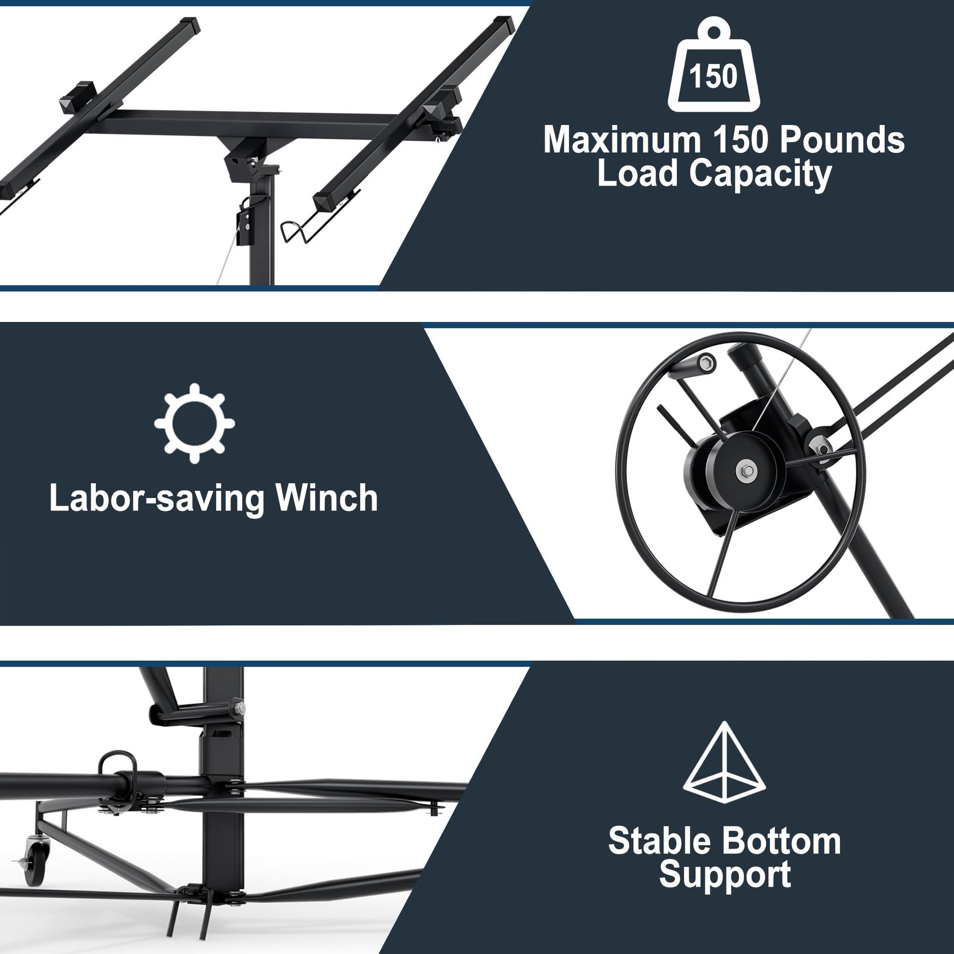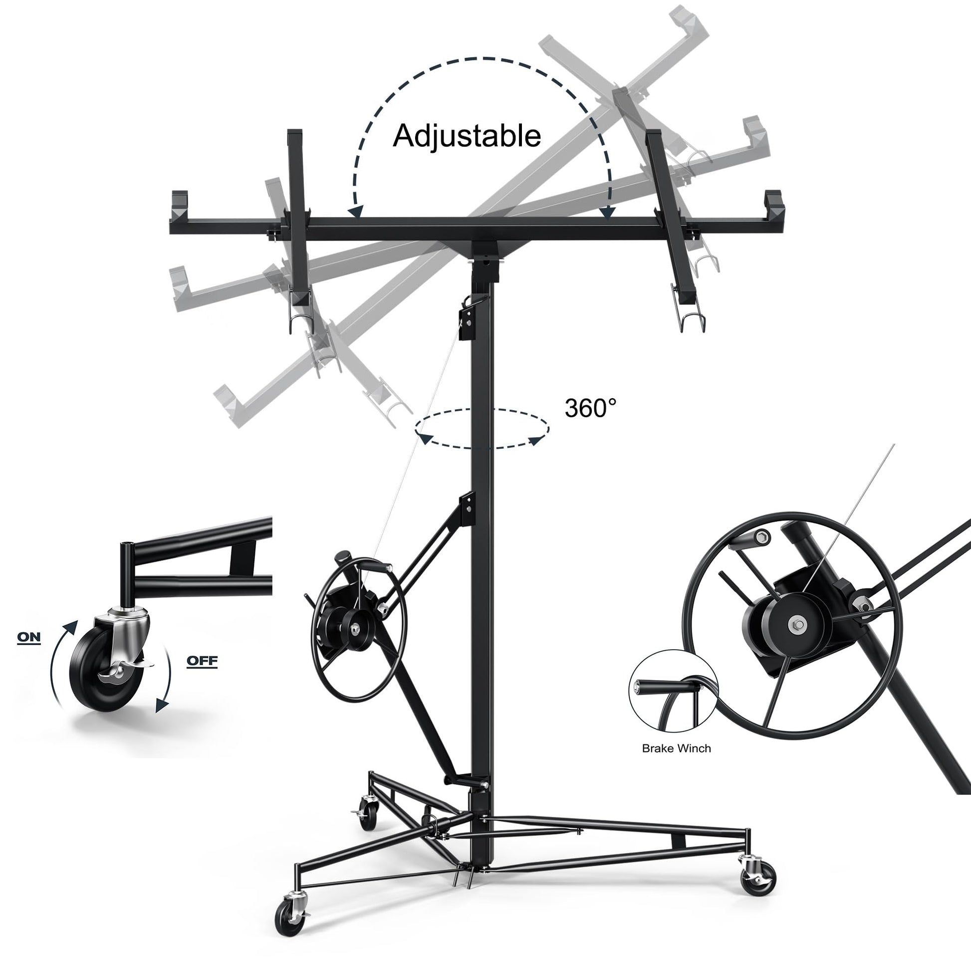 - 150 LBS Capacity Drywall Hoist:This drywall lift is constructed from durable steel,Can load 150 capacity drywall hoist. It features a built-in winch and braking system that ensures smooth and controlled lifting of drywall panels. The triangular base structure enhances stability, preventing wobbling or tilting during operation.