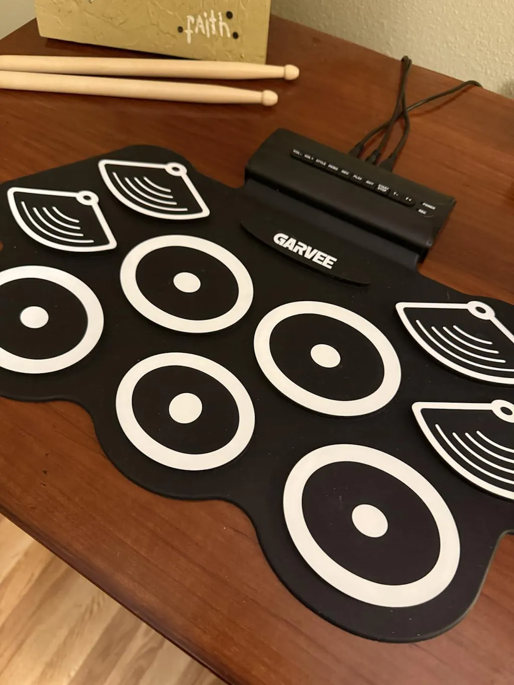 - Rechargeable drum practice pad, up to 10 hours playtime
