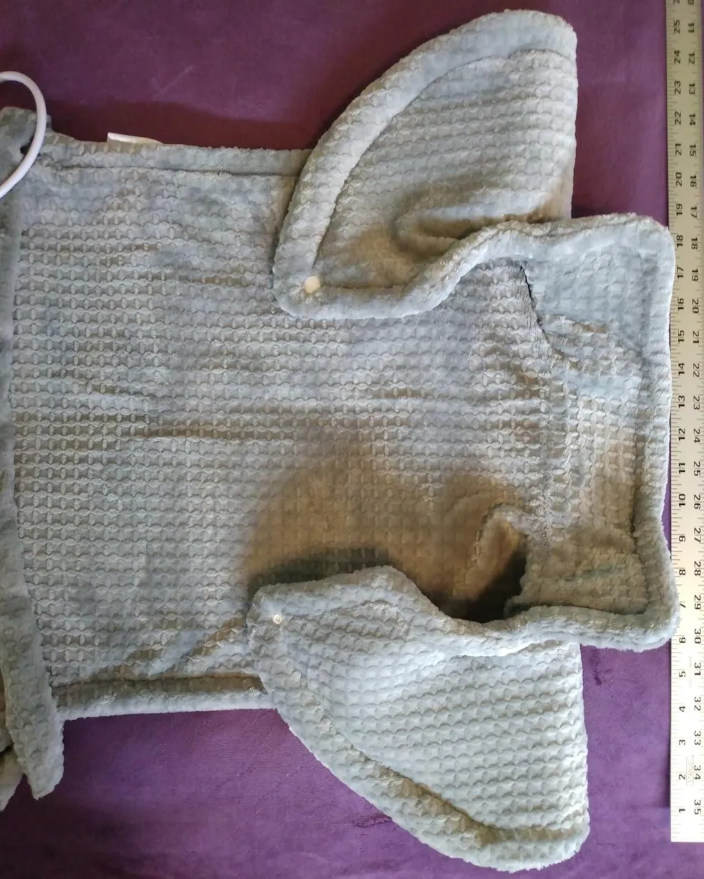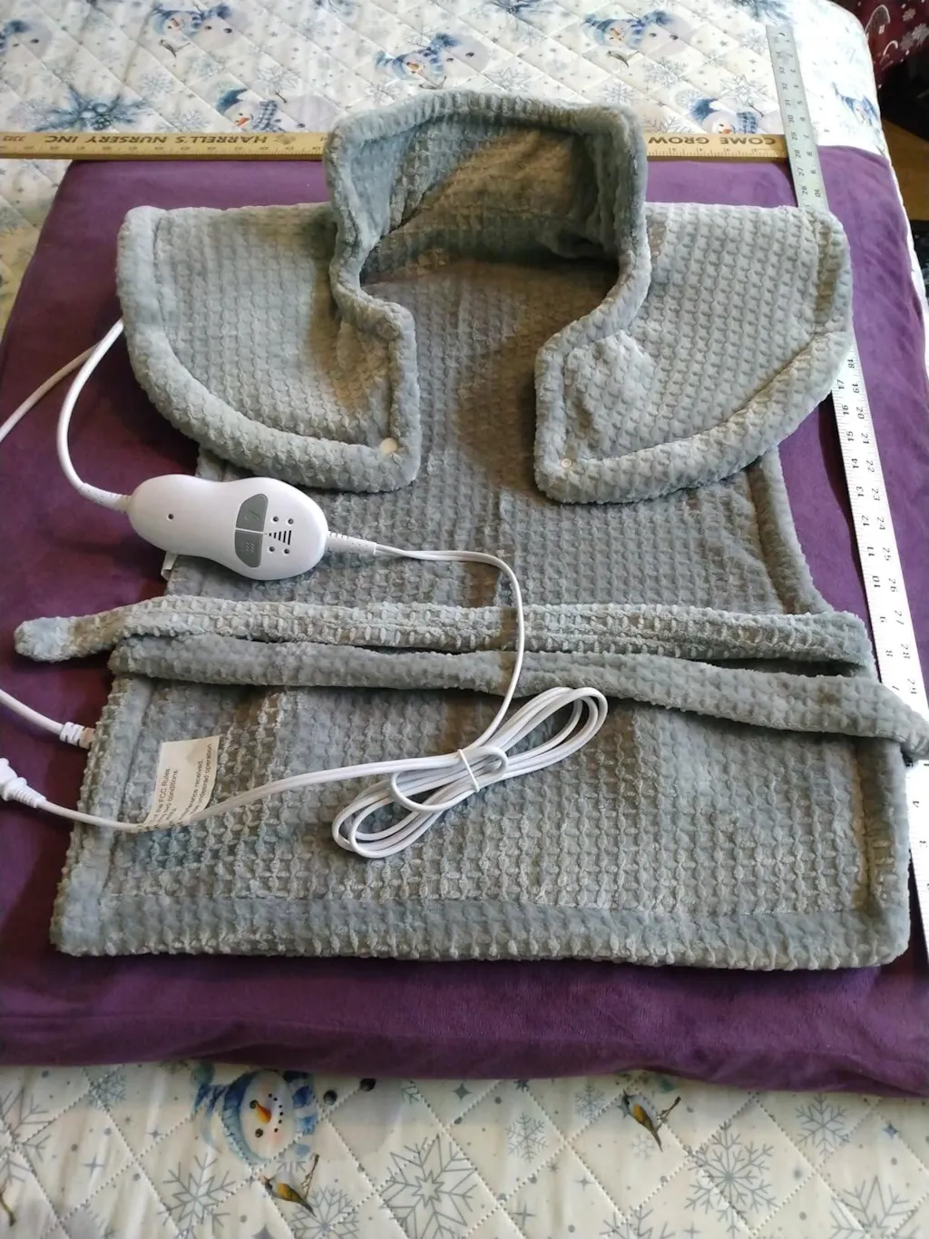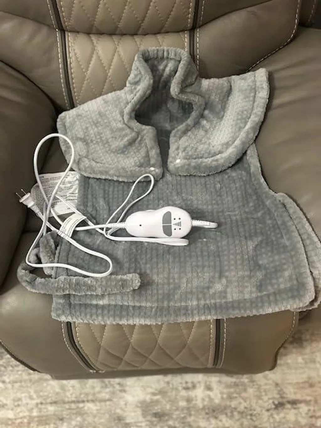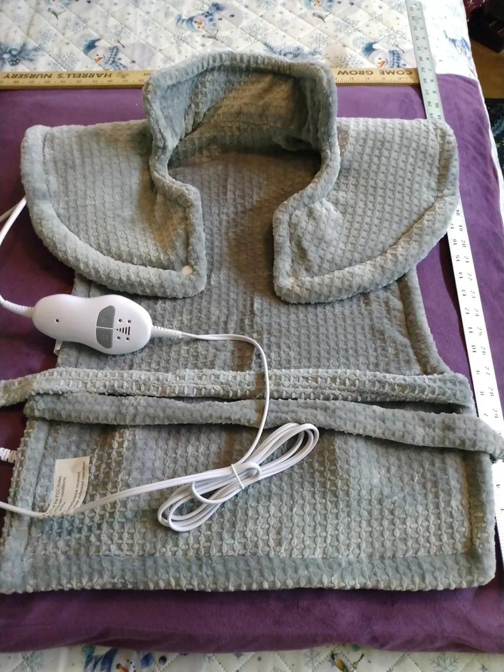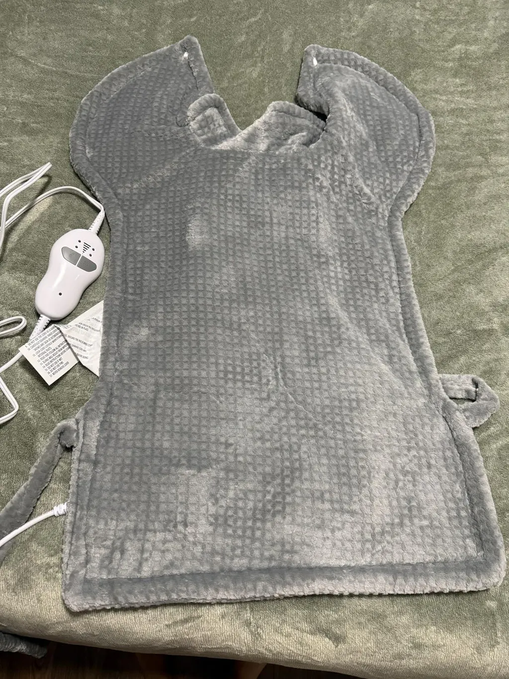 This massaging heating pad is very large and provides great coverage for the neck, shoulders, back, and even the front of the chest. The fabric is soft, plush, and comfortable against the skin, and the front ties help keep it securely in place while seated. It offers two heat levels and multiple massage modes, though the massage is more of a vibration and can feel bulky when lying down, making it best used in a seated position. Overall, it’s a well-made, comfortable heating pad with good heat coverage and safety features (it will turn off after 2 hr by itself), but the massage function may not suit everyone.