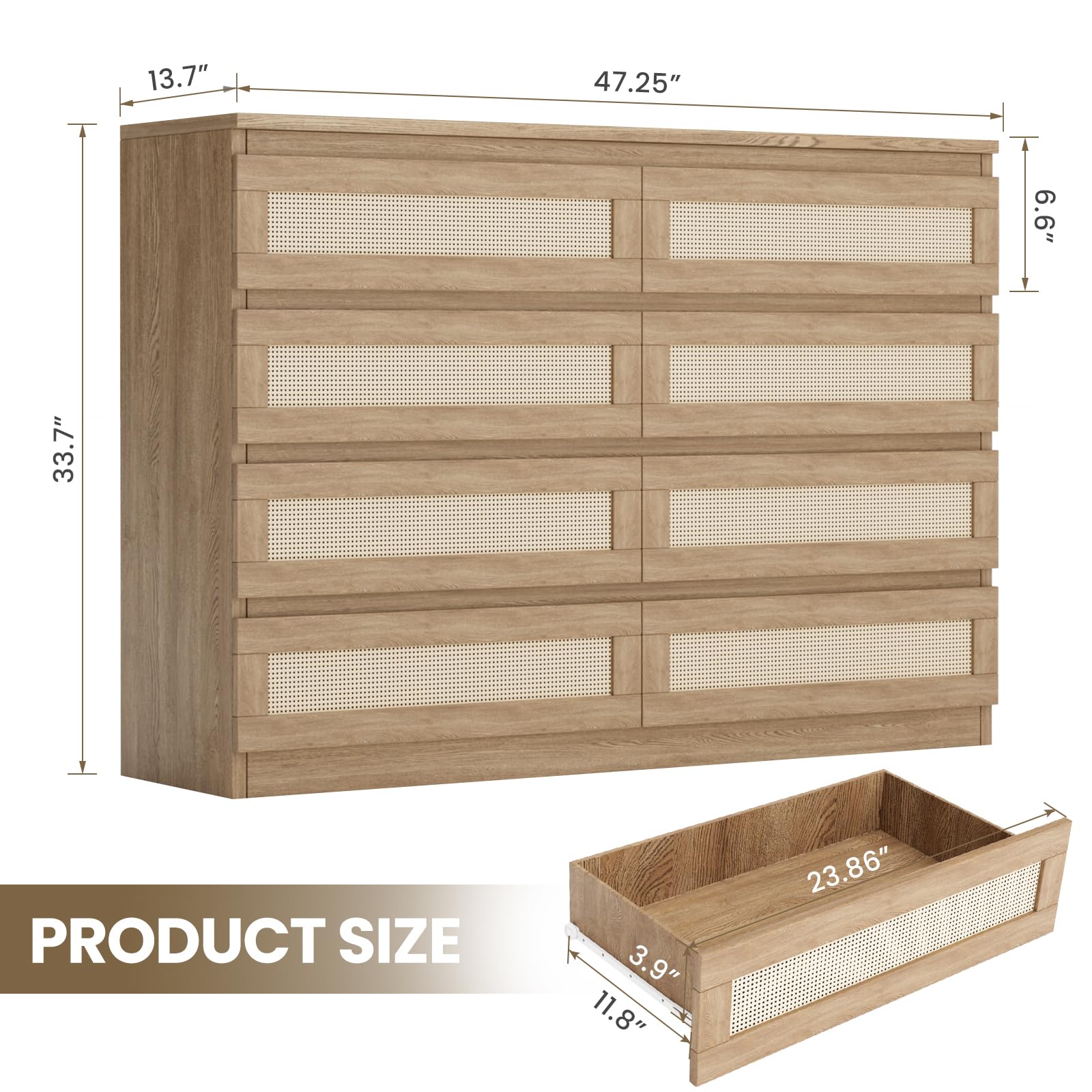 Garvee 8 Drawer Double Dresser - Modern Rattan Chest, Wooden Frame, Ample Storage, Anti-Dumping Device, Bedroom, Living Room, Entryway