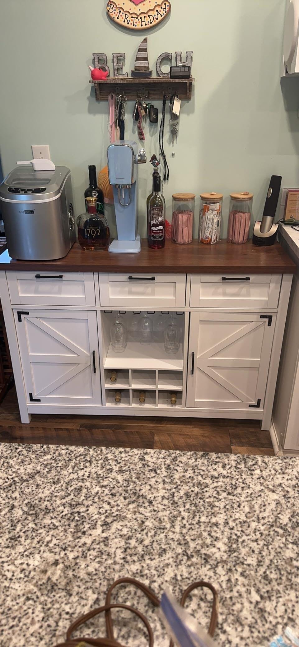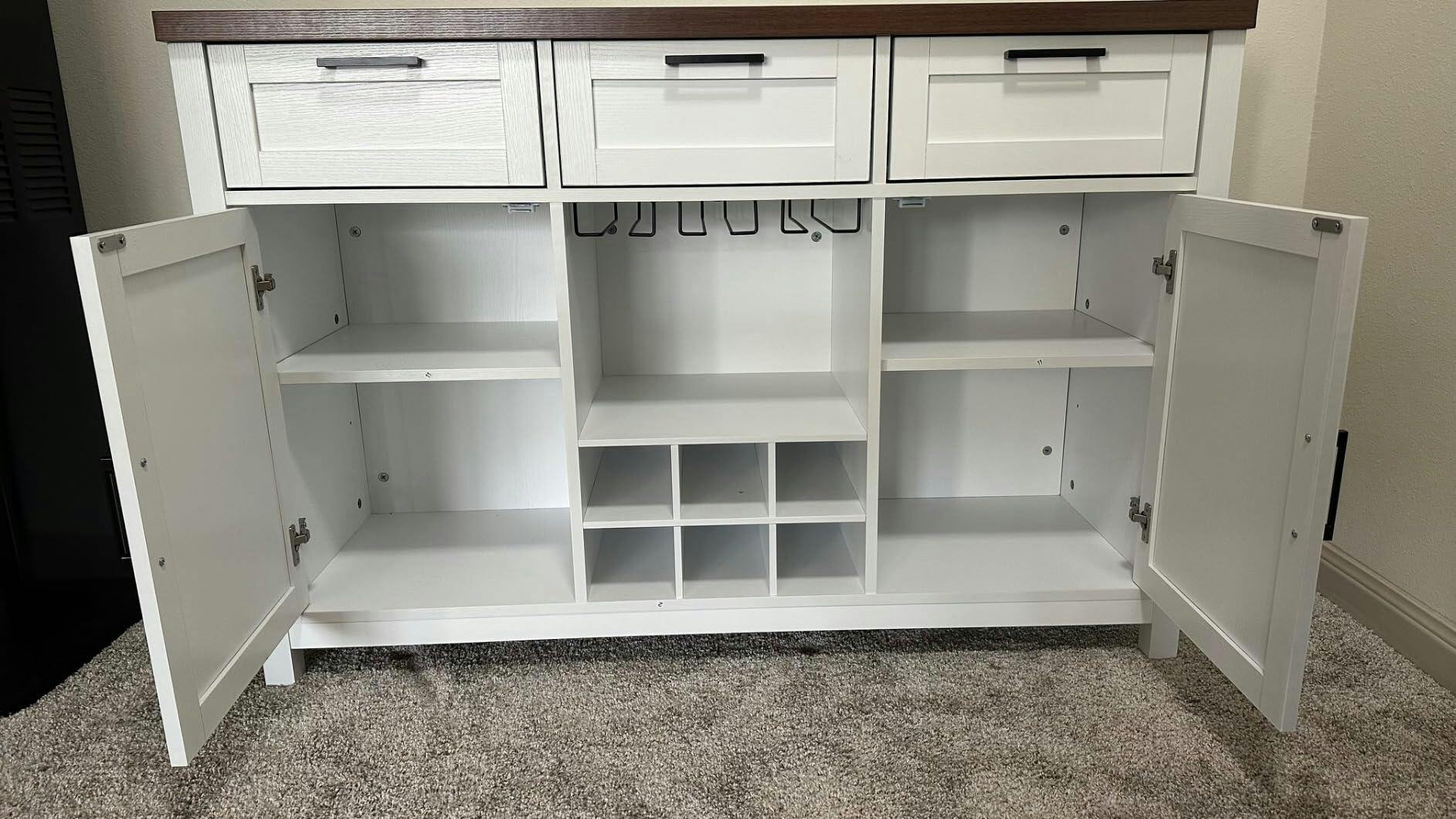 Featuring adjustable shelves, wine and glass racks, and ample cabinet space to organize all your dining essentials.