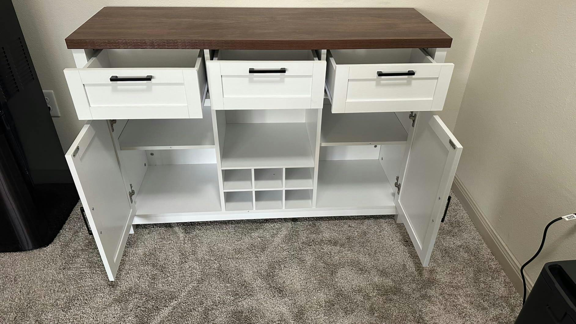 With its spacious 54-inch top surface, three large drawers, and two barn doors, this buffet cabinet combines style with practicality. The adjustable shelves allow for customized storage solutions to fit your unique needs.