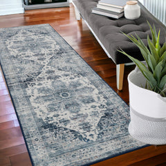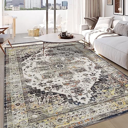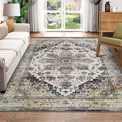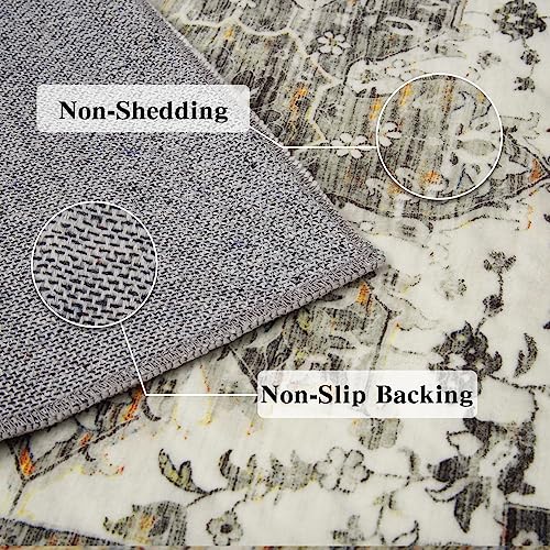 Garvee Grey Area Rug 8x10 Floral Oriental Printed Large Floor Cover Machine Washable Rugs Non-Shedding Floor Mat Soft Blue Living Rug for Bedroom Children's Playroom Rug with Non-Slip Backing