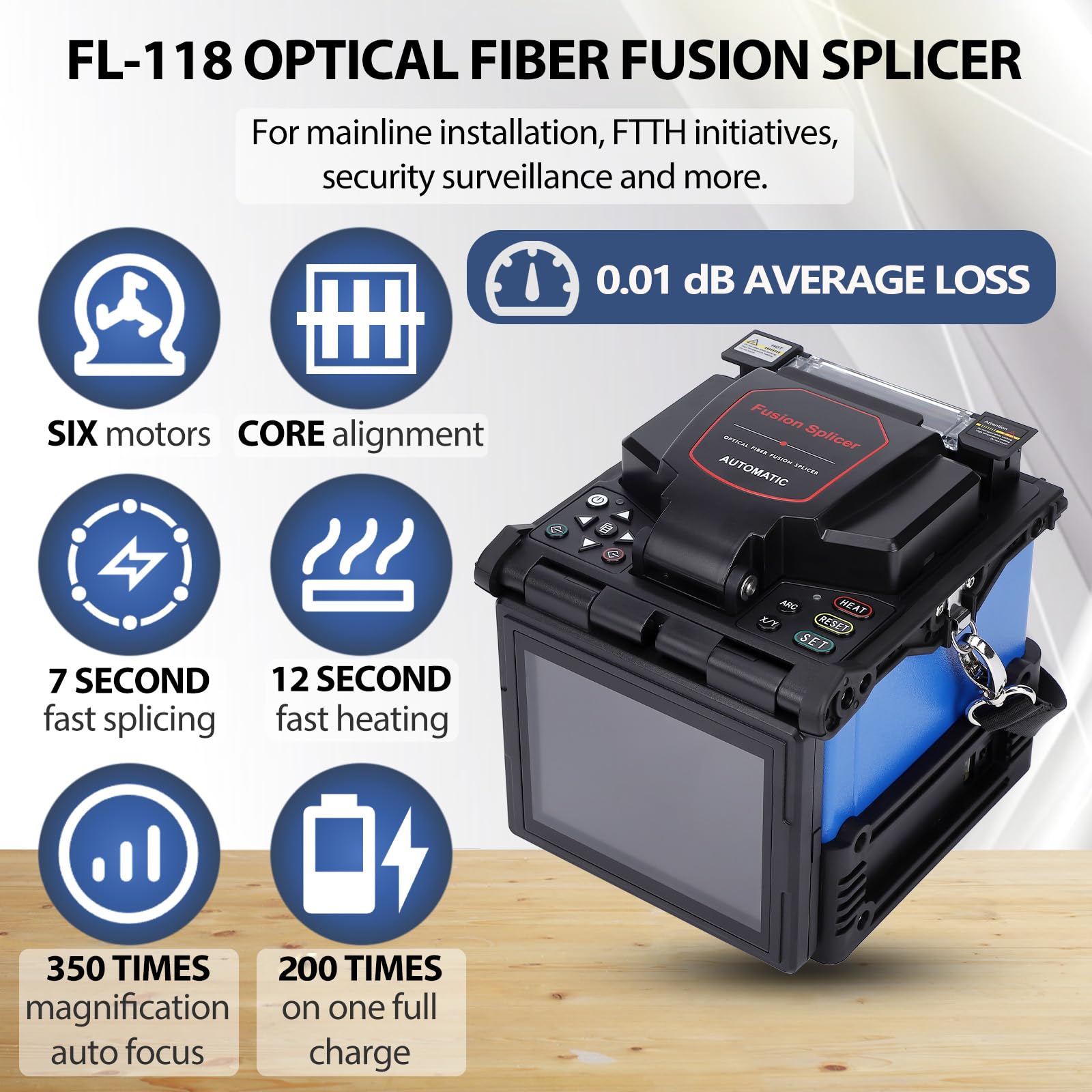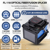 Experience superior fiber optic splicing with our advanced FL-118 model, featuring 6-motor core alignment and impressive 7-second splicing capability. Perfect for professional FTTH installations and maintenance.
