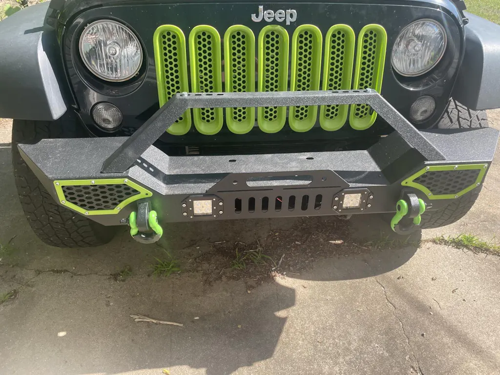 - 【Unique Design】①Features chute design to accommodate additional lights on the tab (Adjustable range: 16 inches - 20 inches). ②Pre-drilled winch holes for direct installation without cutting or drilling. ③Includes a license plate bracket set for convenience. ④Detachable decor allows for customization according to your vehicle.
