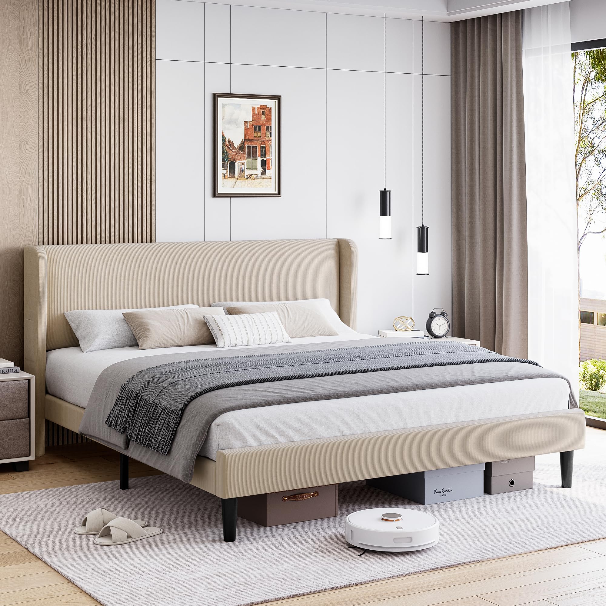 Garvee Full Bed Frame, Platform Bed Frame with Upholstered Wingback Headboard, Heavy-Duty Frame Support, Noise-Free, Easy Assembly, No Box Spring Needed, Beige