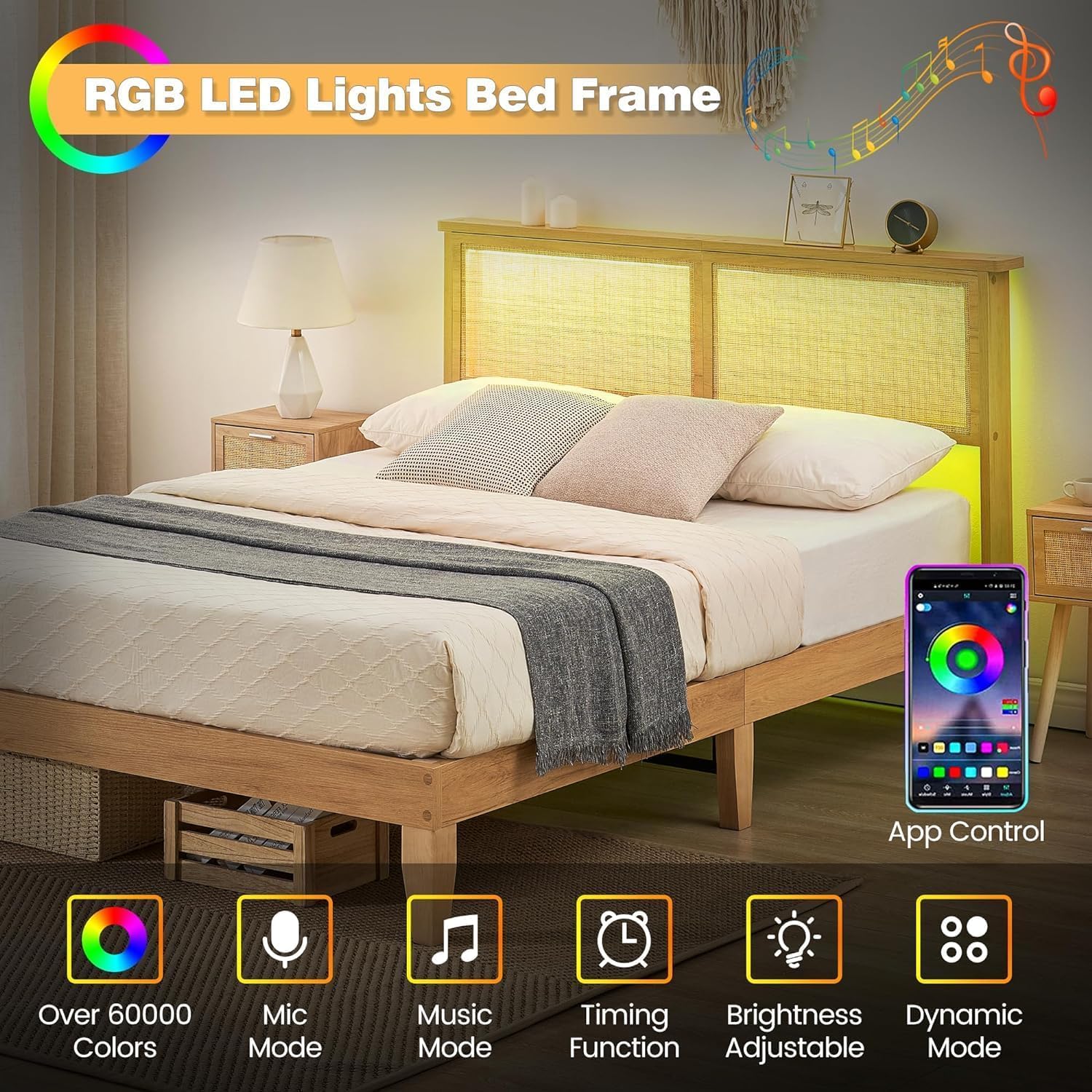 Integrated LED lights behind the rattan headboard create a warm and inviting atmosphere, perfect for setting the mood in your bedroom.