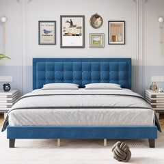 The bed frame is made of durable wood with a central support leg system. This upholstered platform bed with a soft, adjustable headboard is suitable for various mattress sizes. The bed frame has sturdy slat foundations and is durable and reliable.