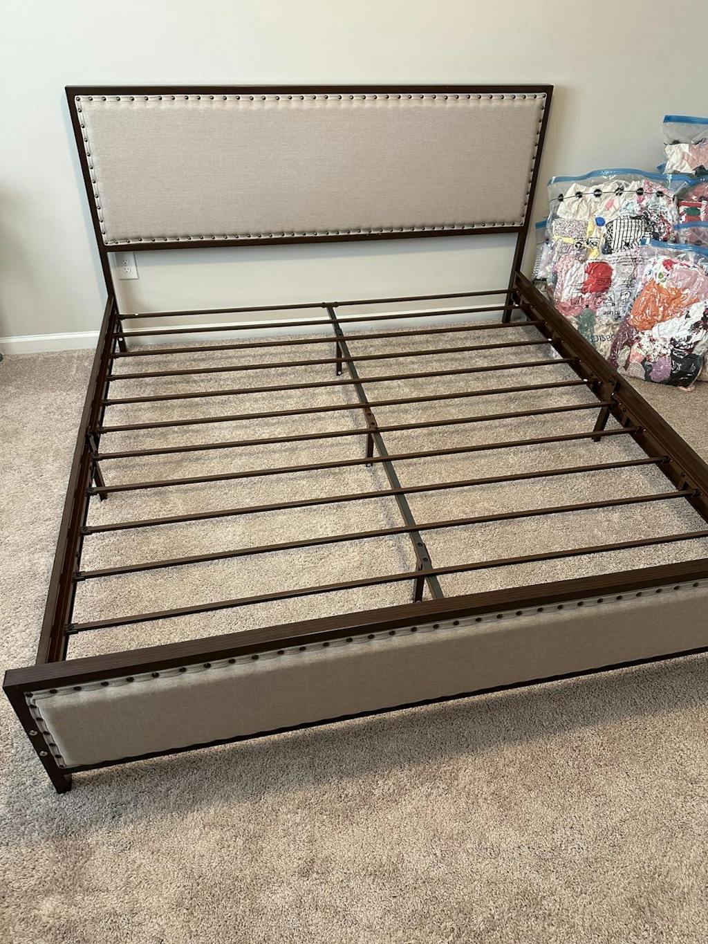 Garvee Full Size Metal Bed Frame, Upholstered Platform with Linen Headboard, Wood Grain Frame, Rivet Design, No Box Spring, Vintage Walnut