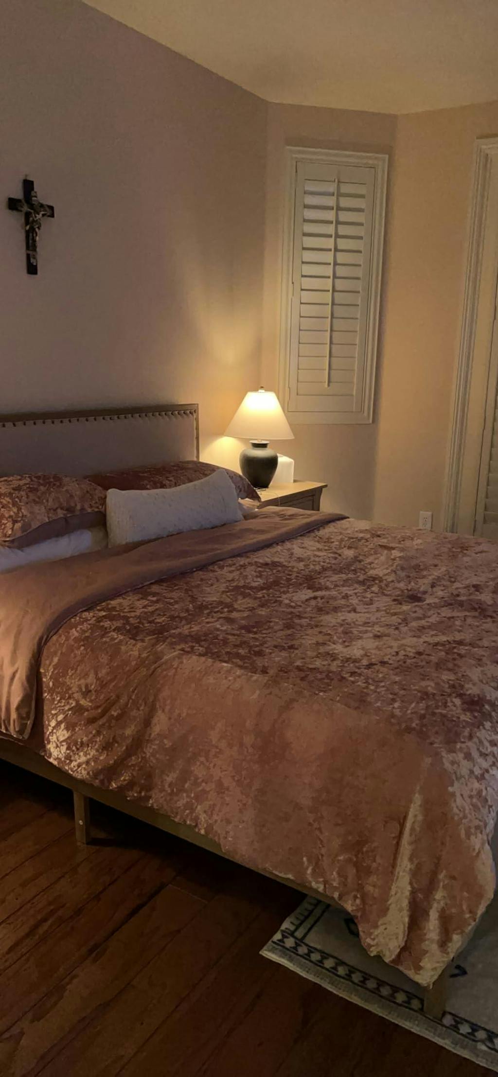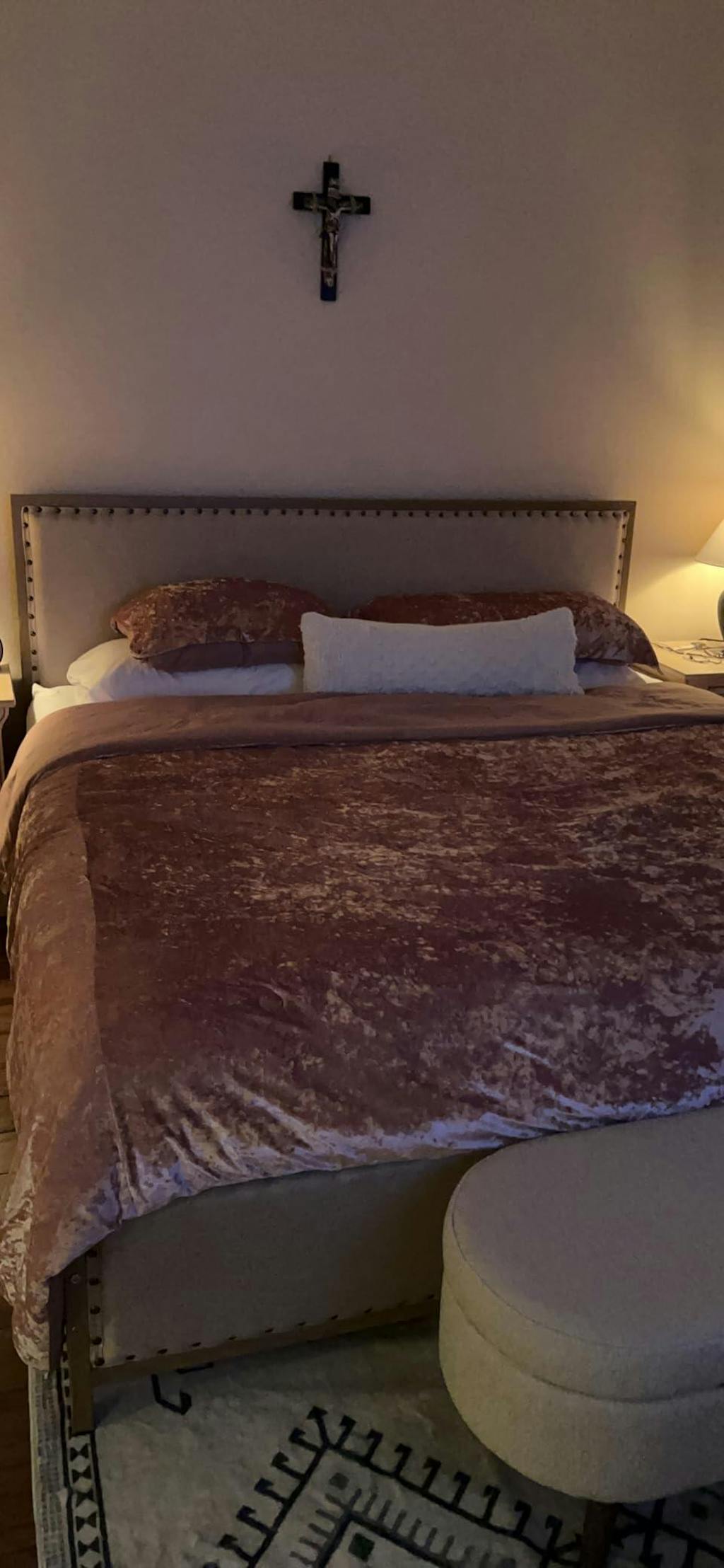 White linen headboard adds comfort and style, perfect for reading or relaxing in bed.
