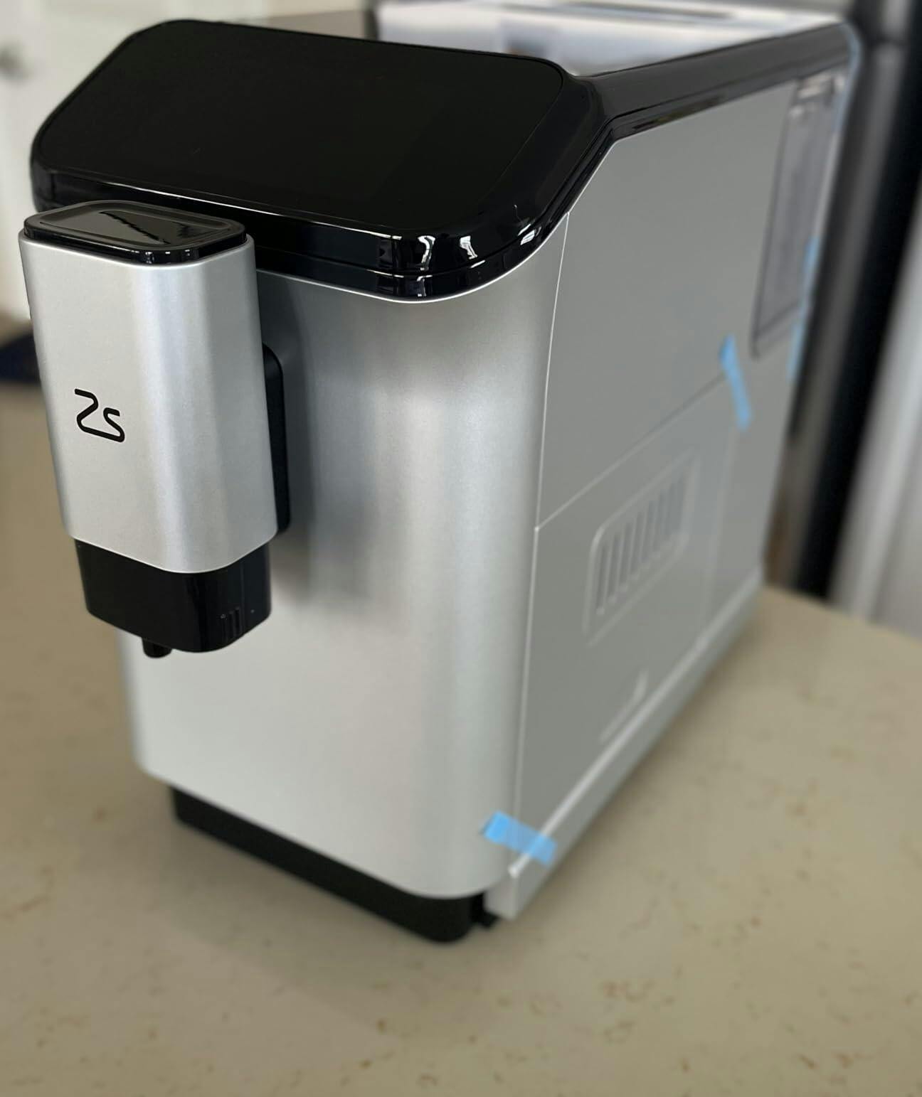 Sleek, Modern Design that looks great on my kitchen counter space. The silver blends in perfectly with stainless steel appliances. The touchscreen is simple to use and has several drink customizations. Coffee beans grind well and lattes taste great with the milk attachment option. Overall, a great value for a full featured coffee machine