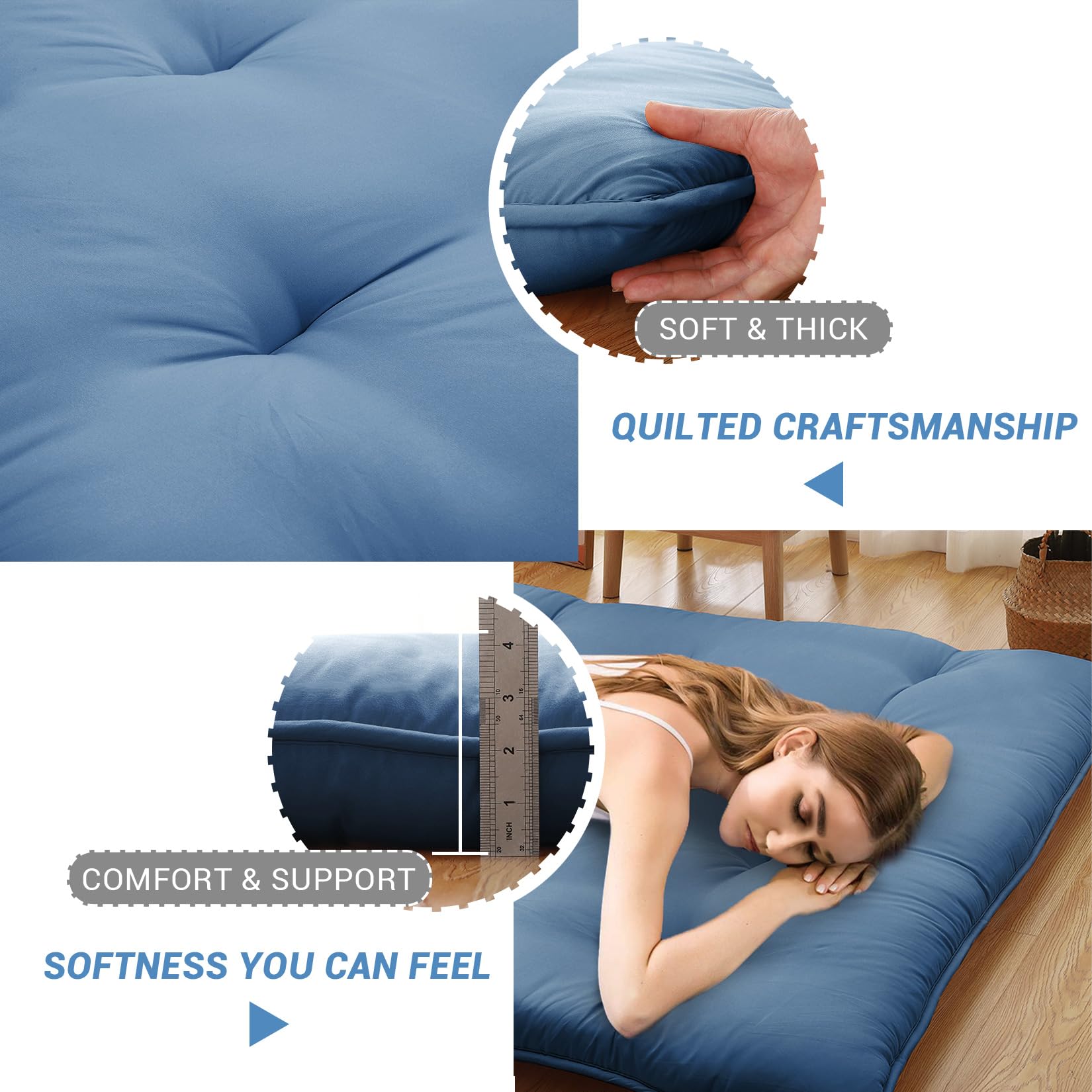 - 5-Layer Futon Mattress Structure: Made of two layers of fluffy cotton fiber with 1.57 Inch high-density supportive foam at the core, you will feel soft and comfortable while sitting and sleeping. Soft premium polyester cover with elegantly quilted pattern, this floor mattress will suitable for your home style and simplify your life.