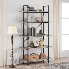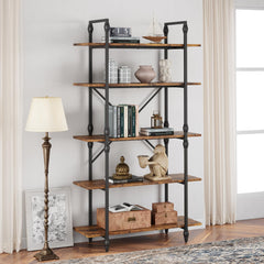 - Retro & Industrial Style: The open 5 tier bookcase combines natural wood grain finish boards with thickened roman column metal tube o emphasize its elegant lines and great craftsmanship in details. All contribute to its personality and the way it enlivens a room and makes an impression.