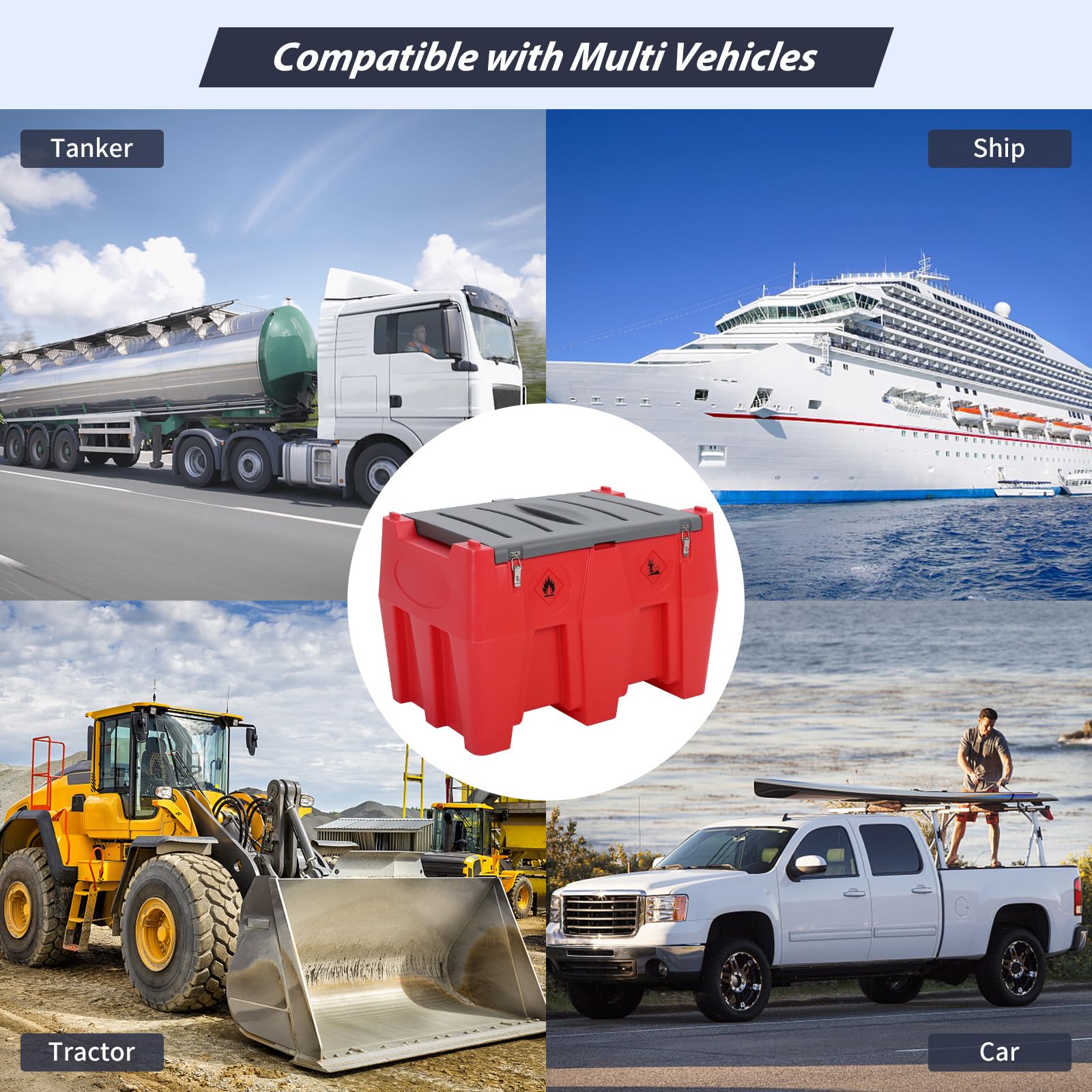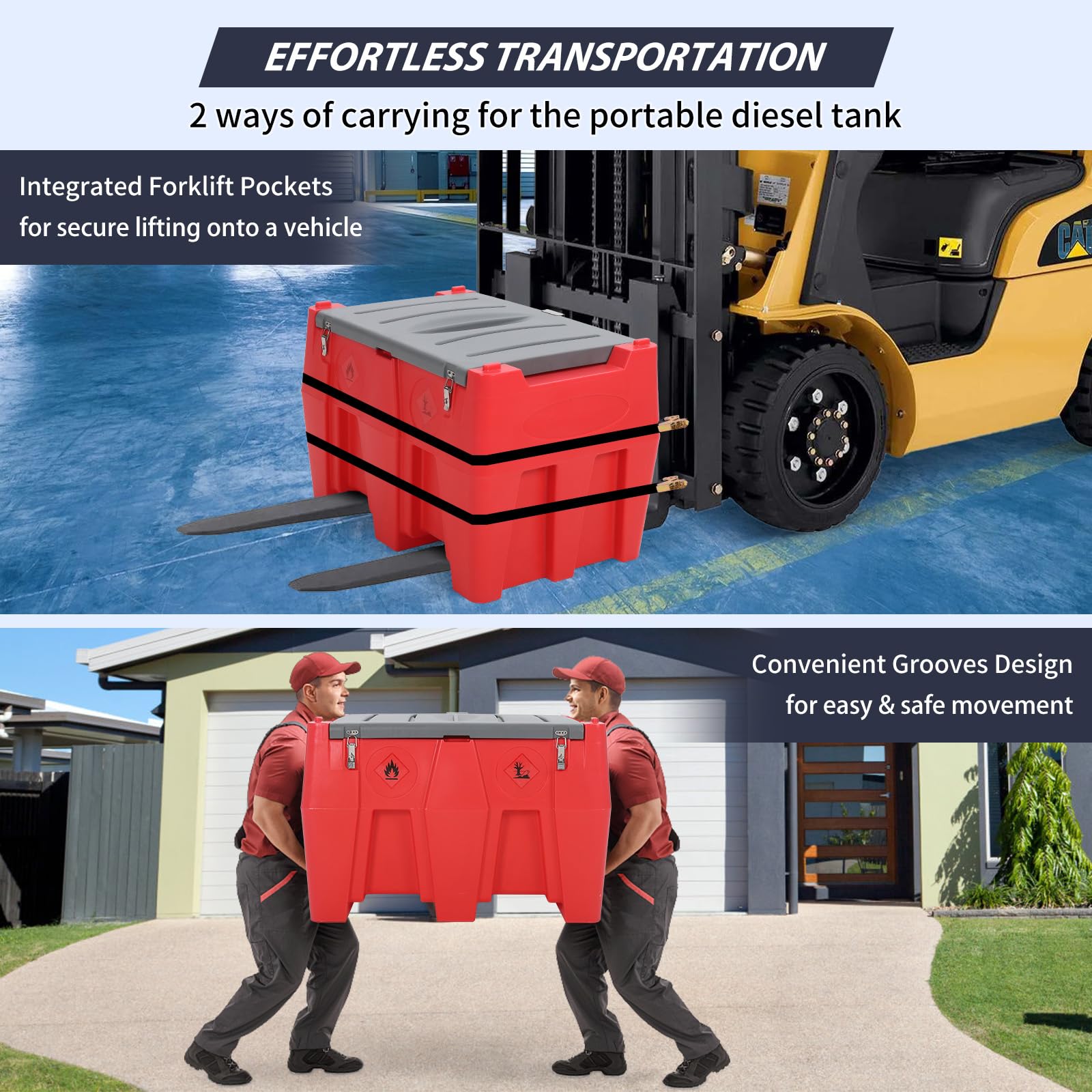 Two safety ropes with aluminum quick-connect buckles are available to secure the diesel tank to the top of your car, tractor, or truck, which prevent slips and falls while in transportation.