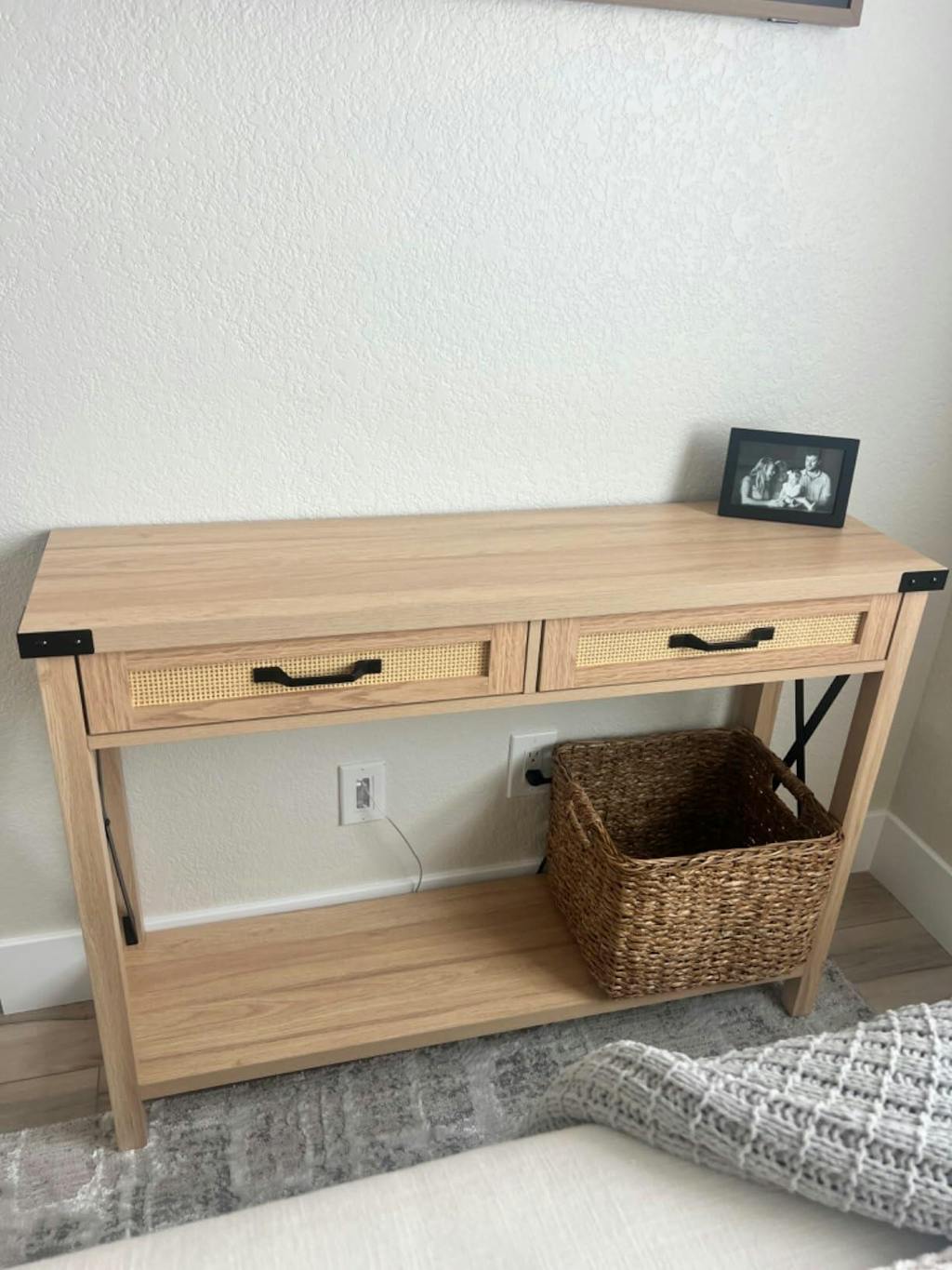 With its durable construction, stylish rattan drawers, and spacious bottom shelf, this console table combines aesthetics with practicality. The sturdy design ensures stability and long-lasting use.