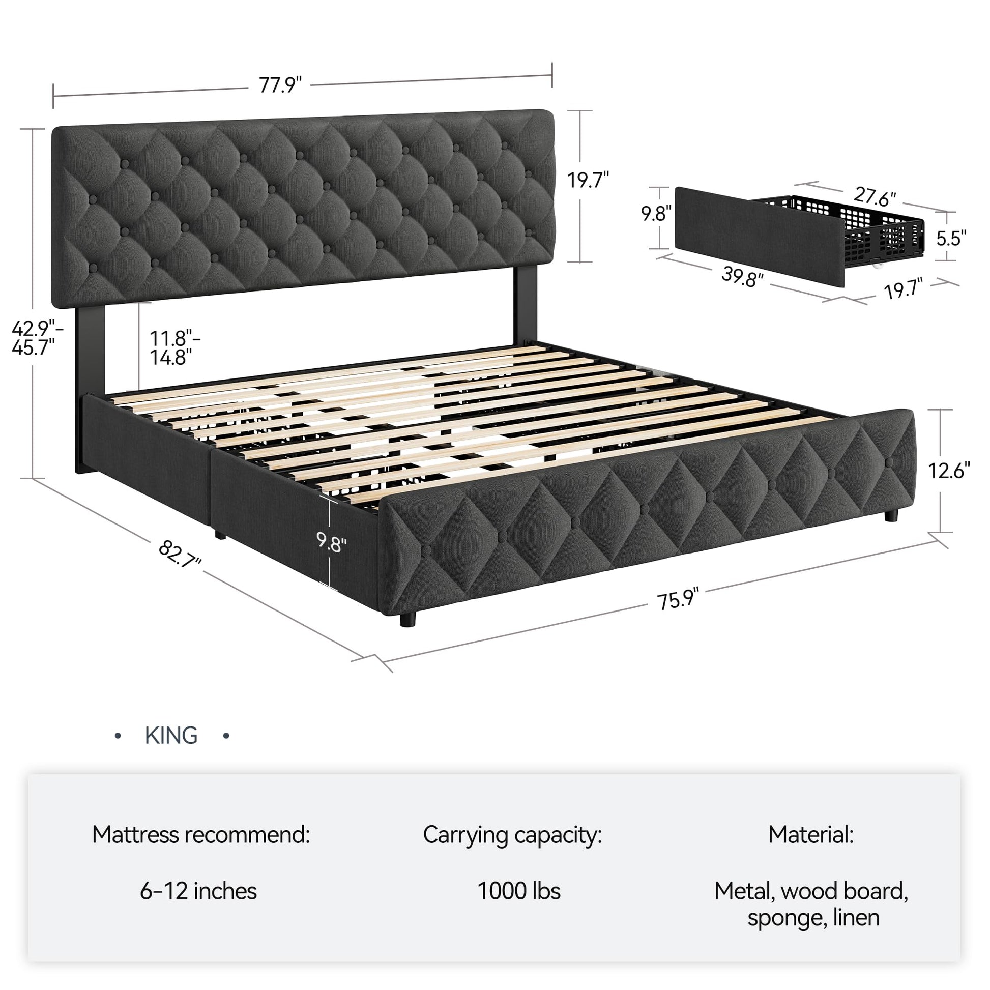 Garvee King Size Bed Frame with 4 Storage Drawers and Adjustable Headboard, Linen Upholstered Platform Bed Frame with Wooden Slats Support, Diamond Stitched Button Tufted, No Box Spring Needed - Dark Grey