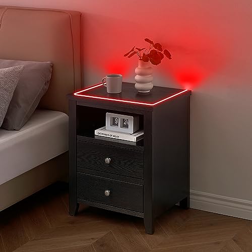 Garvee LED Nightstand with 2 Drawers, Bedside Table with Drawers for Bedroom Nursery Living Room, Side Bed Table with Sports LED Light, Black