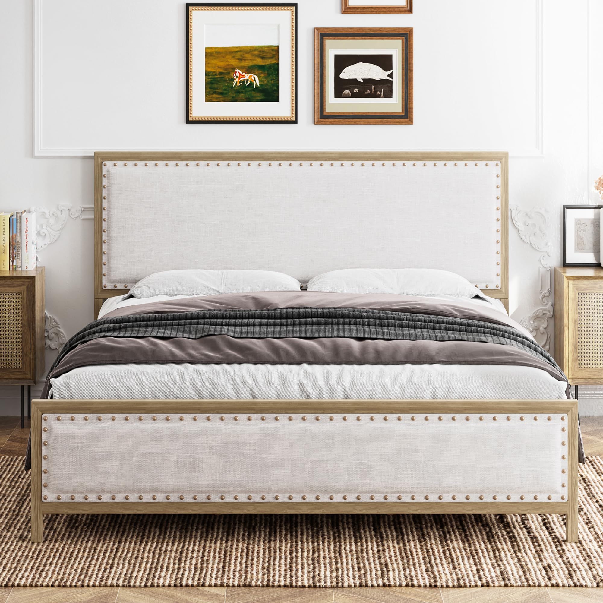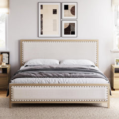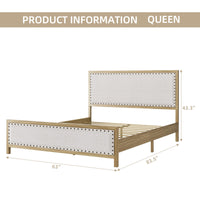 Garvee Queen Size Metal Bed Frame with Linen Upholstered Headboard, Wood Grain, Rivet Design, No Box Spring Needed, Vintage, Natural