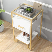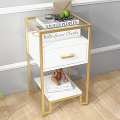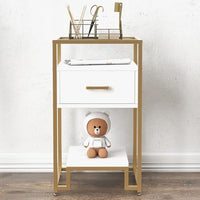 With its sleek white and gold design, high-quality particle board construction, and easy assembly process, this nightstand combines modern aesthetics with practical functionality.
