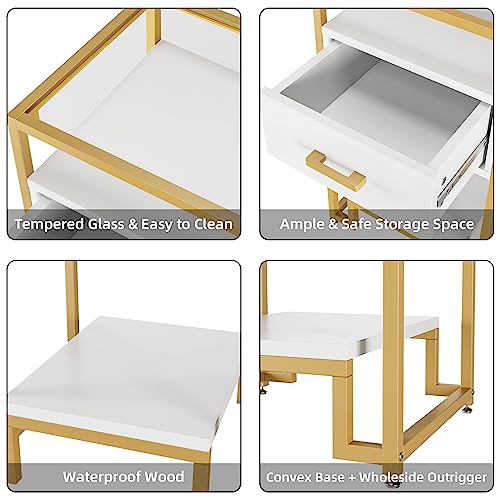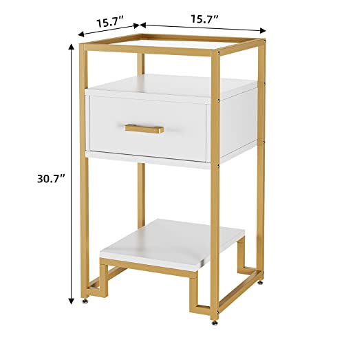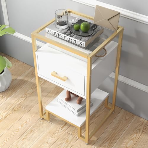 Garvee Mid Century Modern Nightstand + Storage Drawer & 3-Tier Shelving + Tempered Glass Top + Steel Frame + Easy Assembly + Bedroom, Dorm