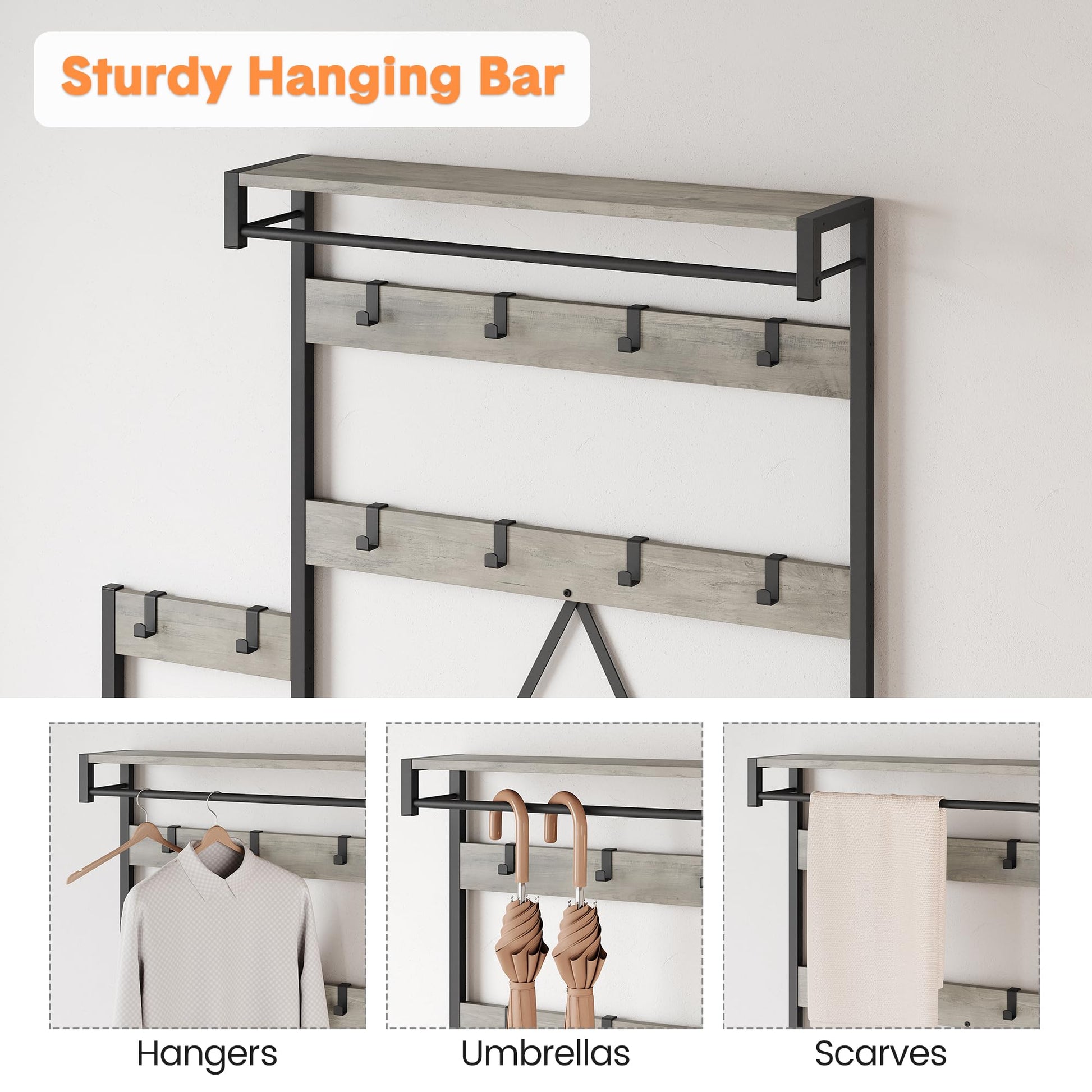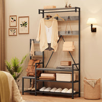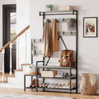 All-in-one solution with coat hooks, hanging bar, bench, shoe rack, and storage shelves to meet various organization needs.