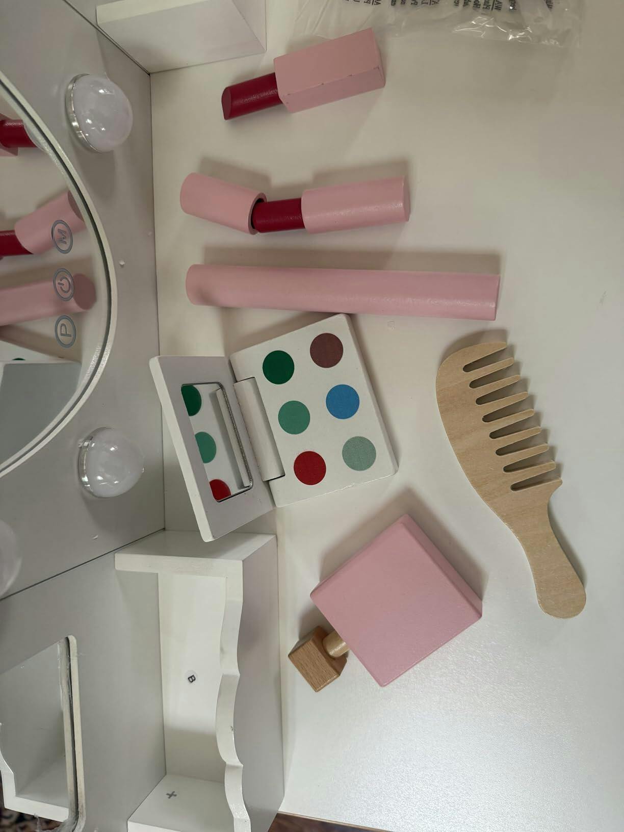 - Pretend Play and Dress-Up Fun: Our vanity set includes a vanity table, a stool and a set of Wood Makeup Playset. It can be used as a delightful pretend play set and as a real, exclusive dress-up area for your little ones.