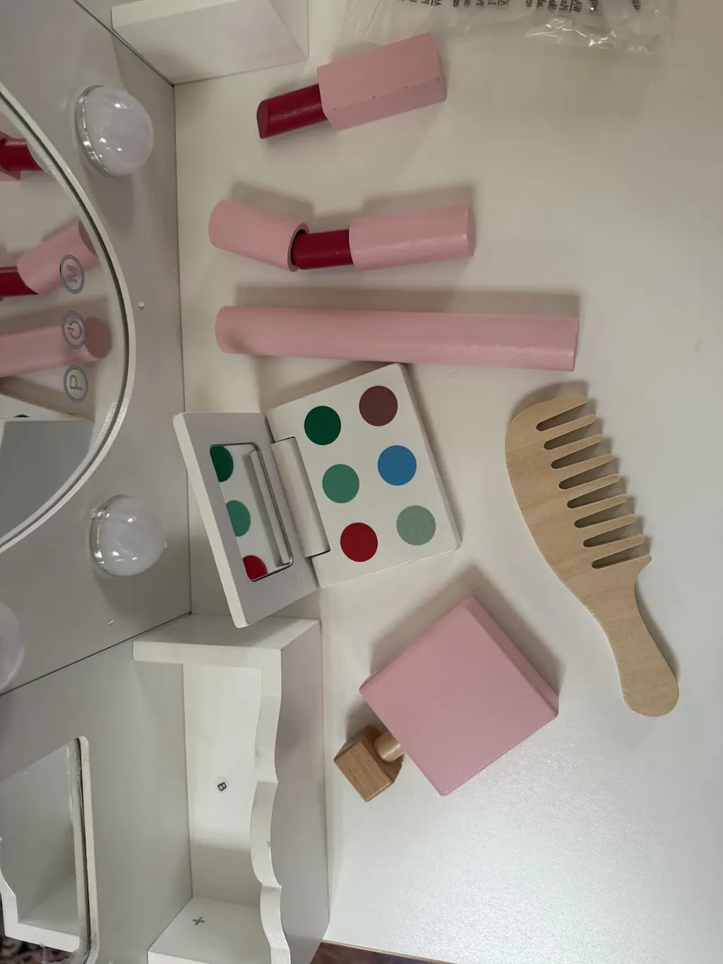 - Complete Pretend Play Set: Includes table, stool, and wooden makeup toys for endless dress-up and imaginative fun.
