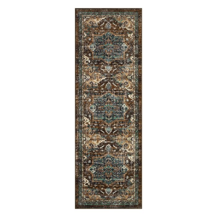 Garvee Boho Tribal Washable Runner Rug 2x6 - Non-Slip, Vintage Distressed - Wool-like Polyester, Stain Resistant - Brown/Green, Entryway/Bathroom