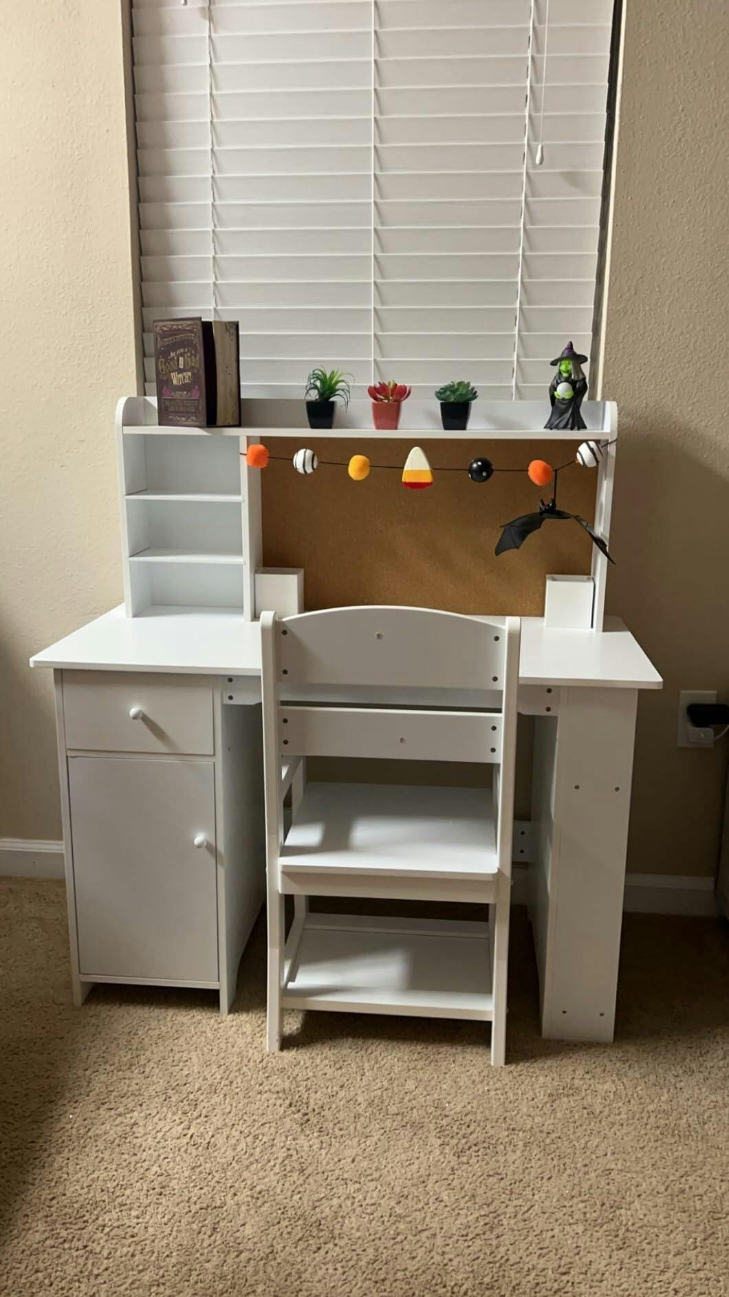 - Ample Storage Capacity: Our desk set features generous storage options, including open storage, a bookshelf, cabinets, and a cork board. Easily organize and store personal items like photo frames, alarm clocks, mini plants, dolls, and books.