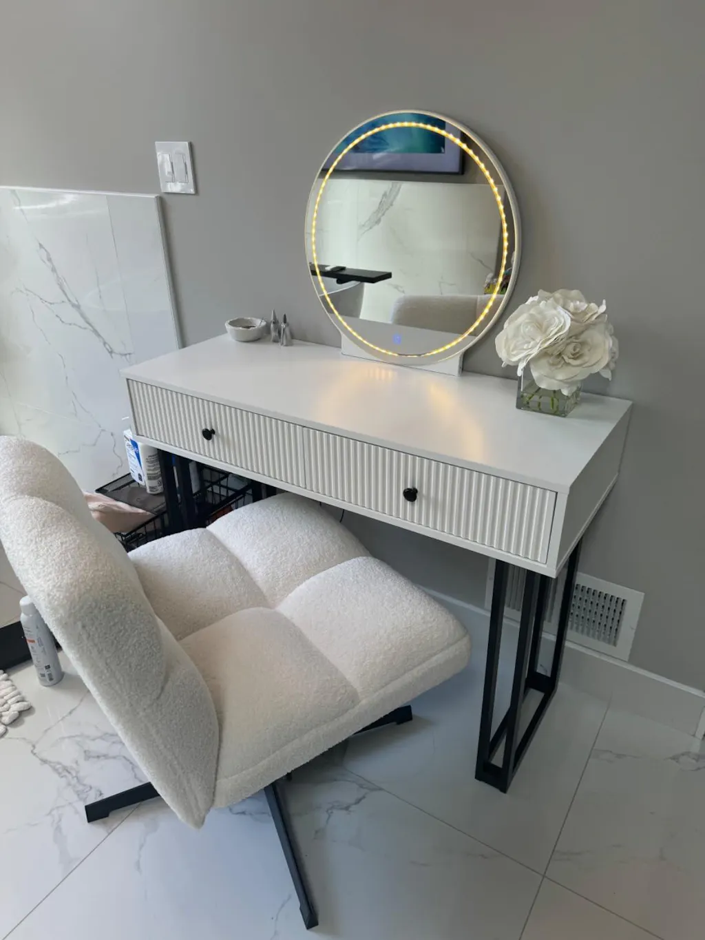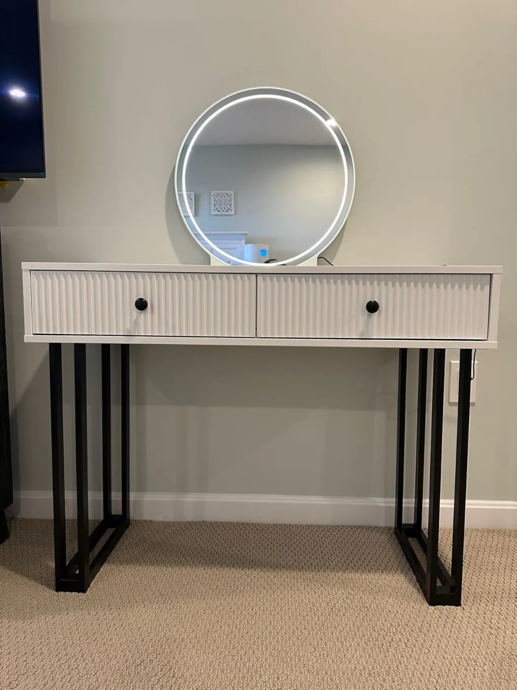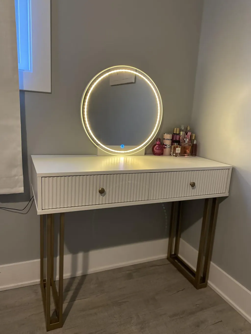 - 3-Color LED Light - The vanity desk has a smart LED mirror, 3 color modes(warm yellow/warm white/cold white), and adjustable brightness to meet all your scene needs, perfect for home, salon, or live broadcast.