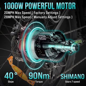 90 Nm power, 20 mph default or 28 mph unlocked, Shimano 7‑speed