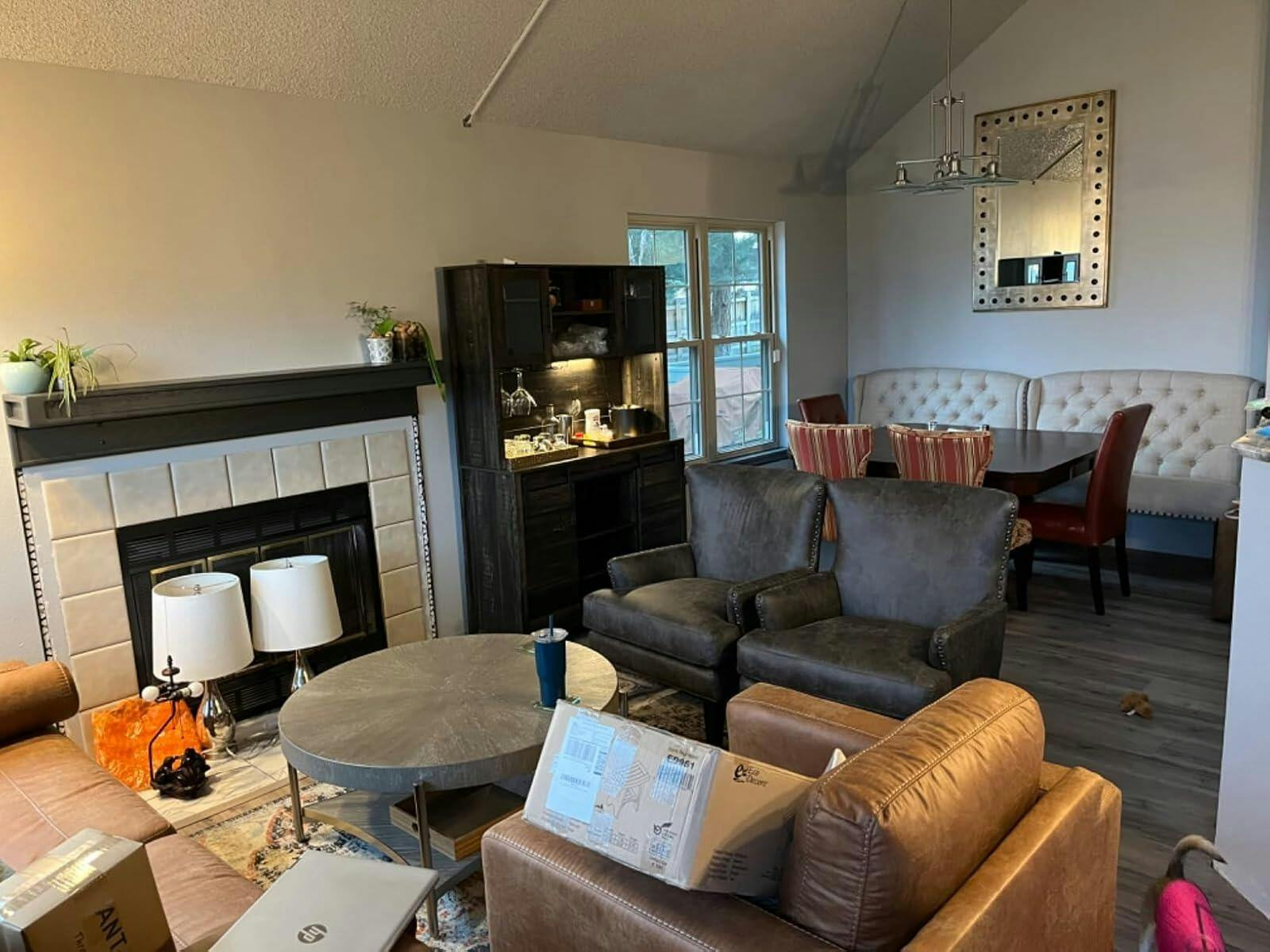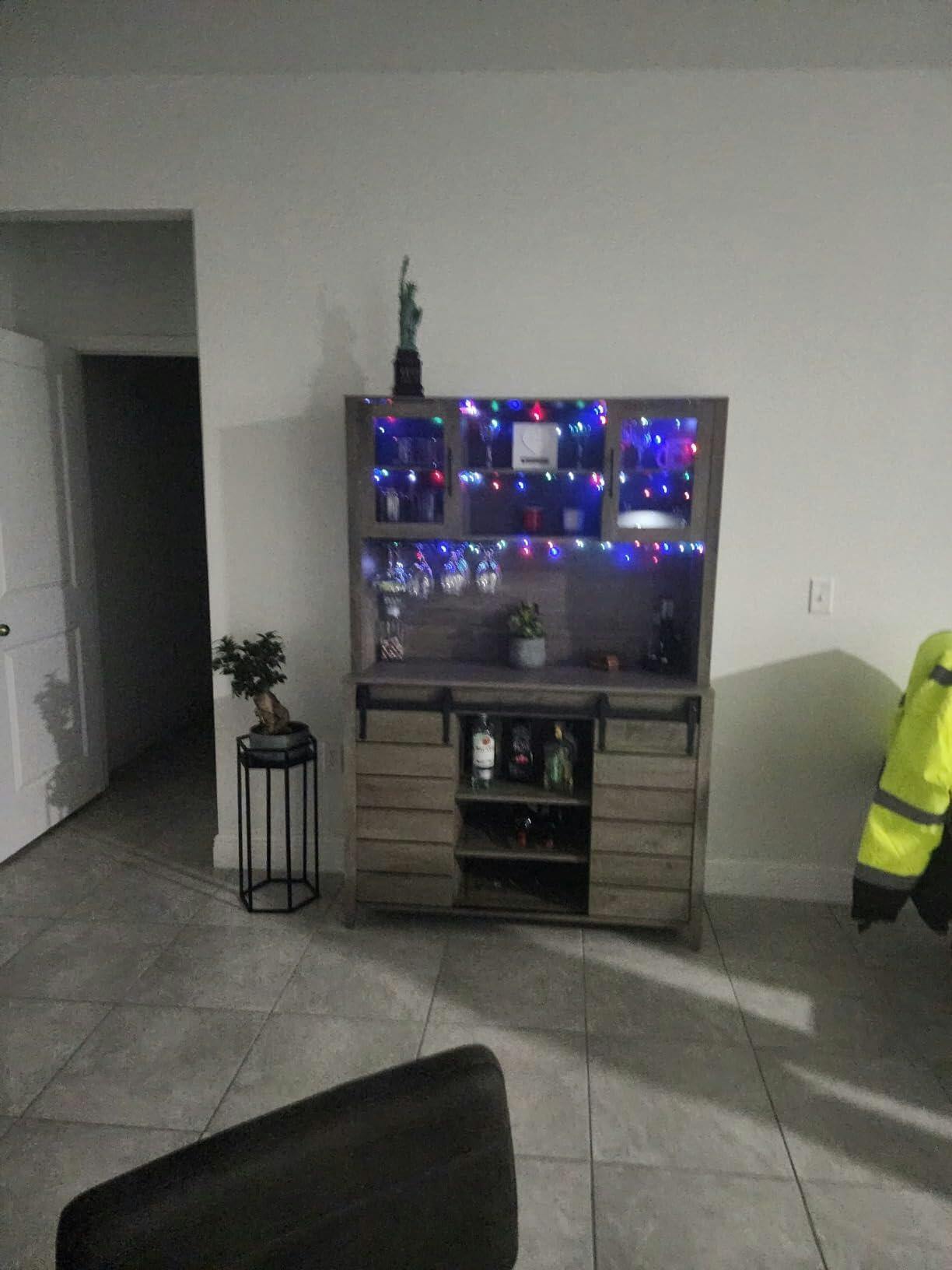 I love this bar! It wasn’t easy to put together but me and hubby got the job done. I even added some wallpaper as a backdrop, as it matched my walls and decor. I love how it came together. I also got the wallpaper from Garvee. I love the whole look of this.