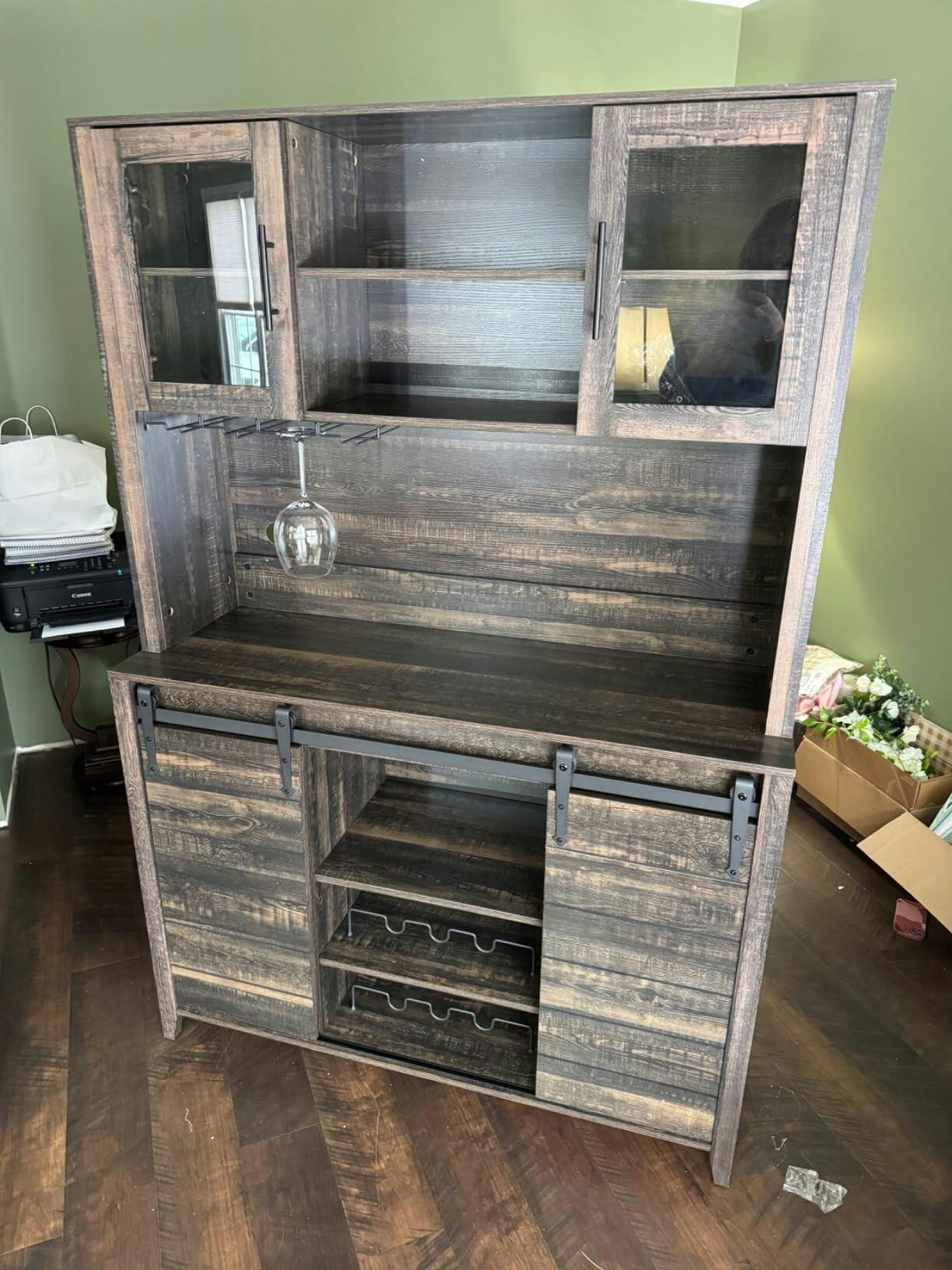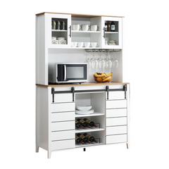 - Bottom Buffet Cabinet: 2 sliding barn door, 7 adjustable shelves, 6 bottle wine racks, Adjustable metal middle support leg.