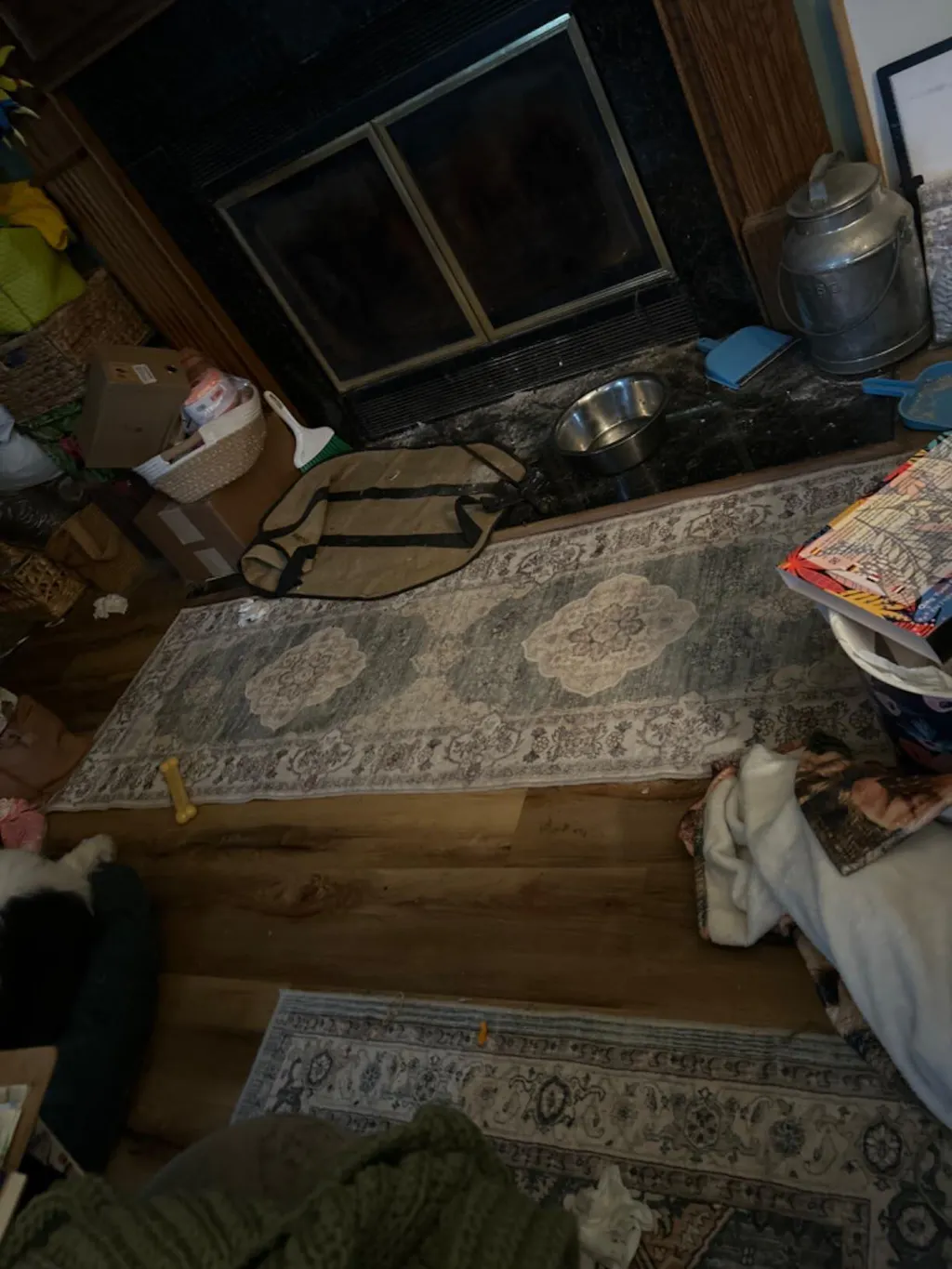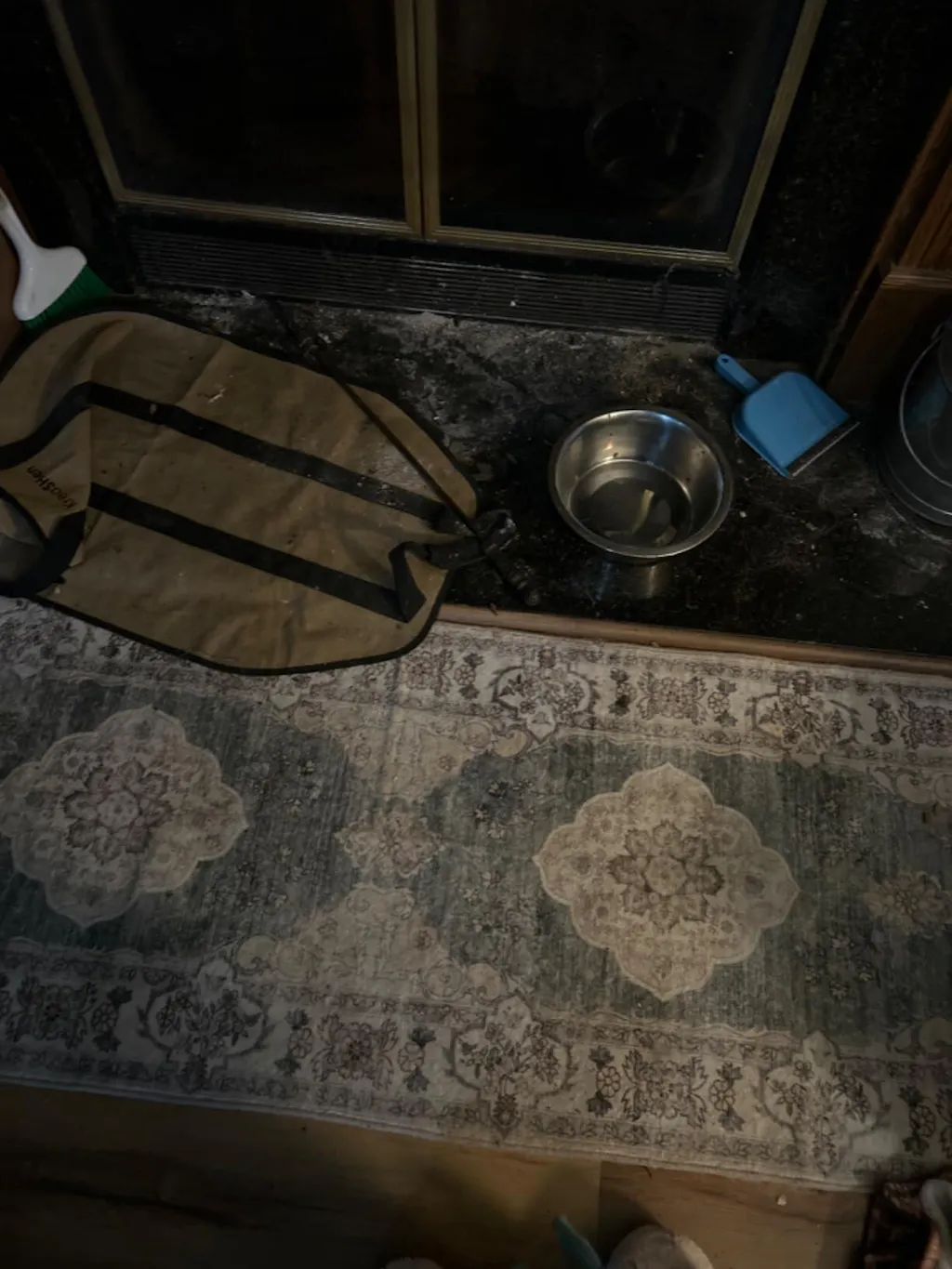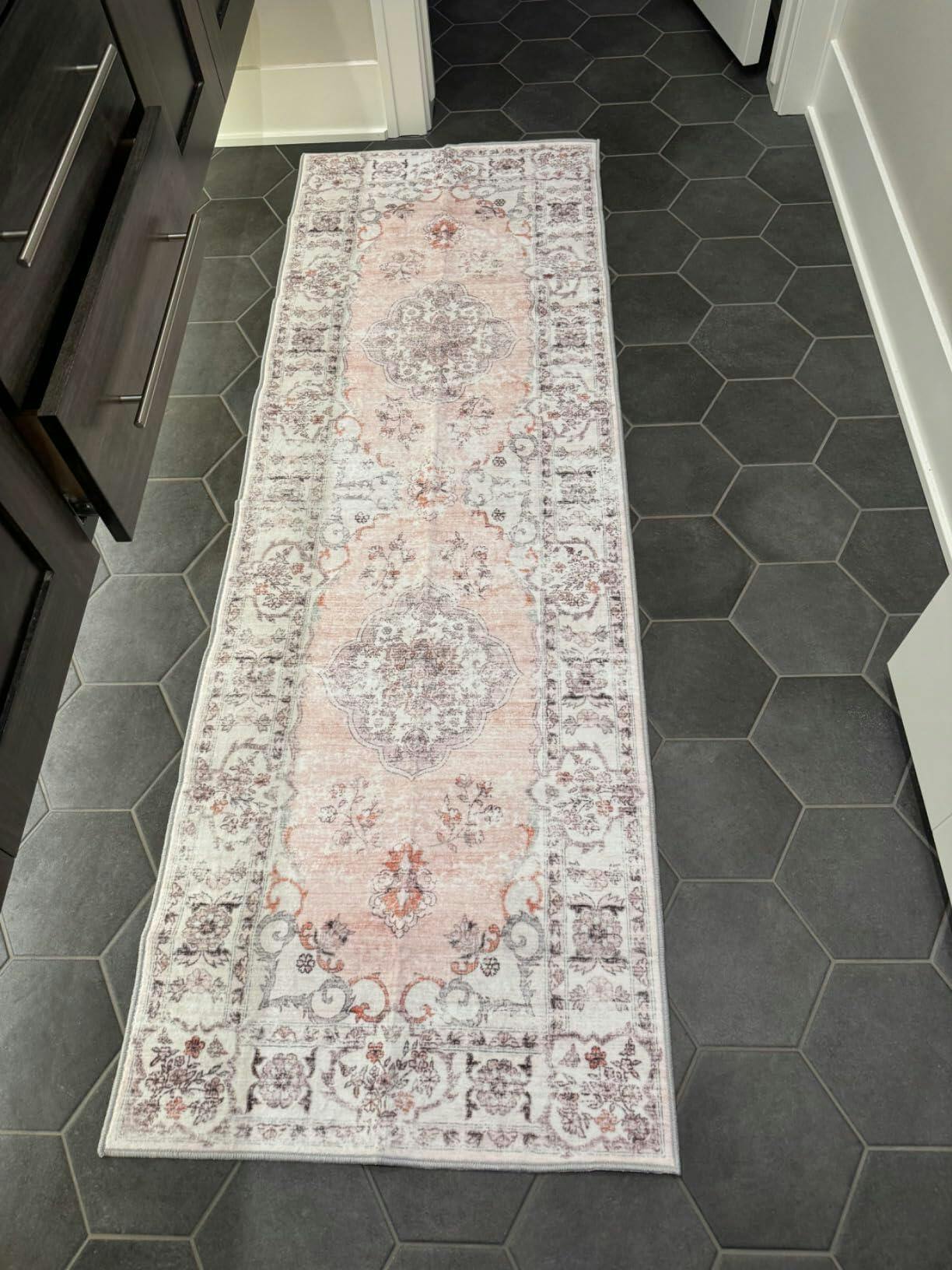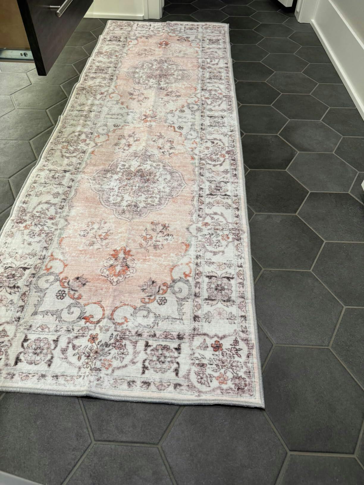 Love this rug!! Perfect runner size for in front of fireplace, delineating the walking path to the hallway leading to attached garage walk-thru door. It looks lovely in here. You will see how well it goes with our shade of sage-y green. The rug’s color scheme is perfection. It is very thin and lightweight, but this is not a cheap or cheesy craptastic flimsy rug at all. It’s light so it will be easily washable without putting too much wet, dead weight in your washer. It has a low low pile which is awesome on a washable rug - it dries a lot faster. All in all a very pretty, decorative and practical rug