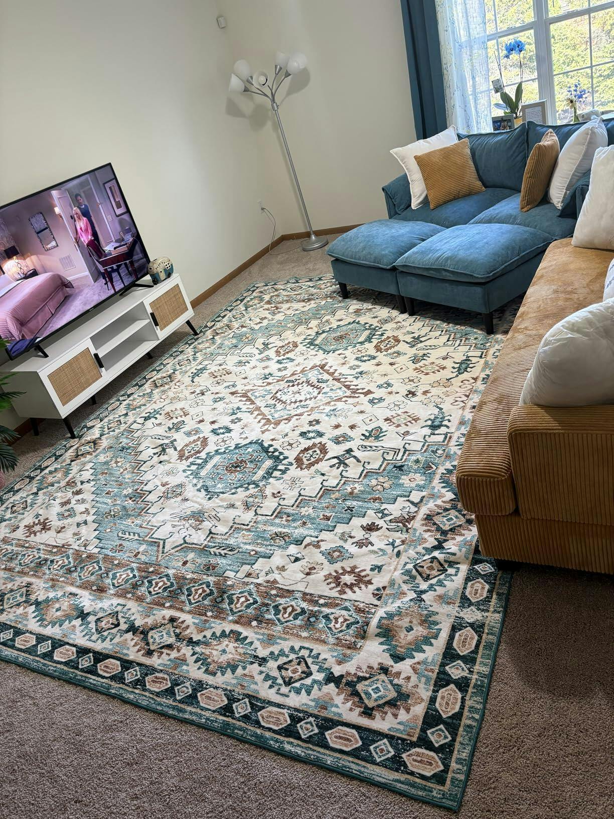 We absolutely love this rug for our living room. My only discretion is the pictures made it look a little greener than it is. But it still works for us! It’s so soft on our feet. That’s a bonus!