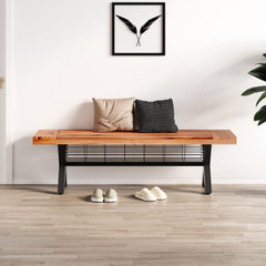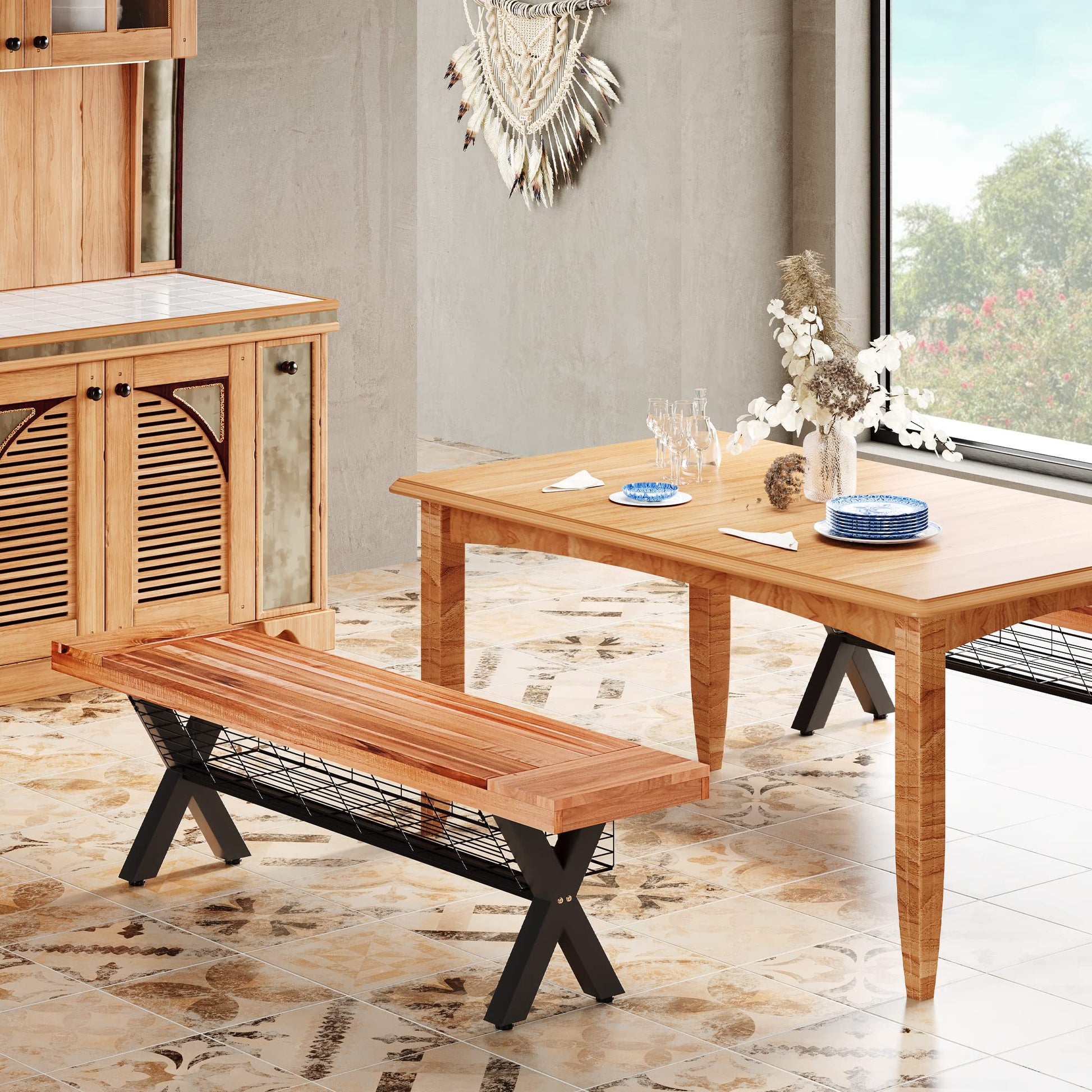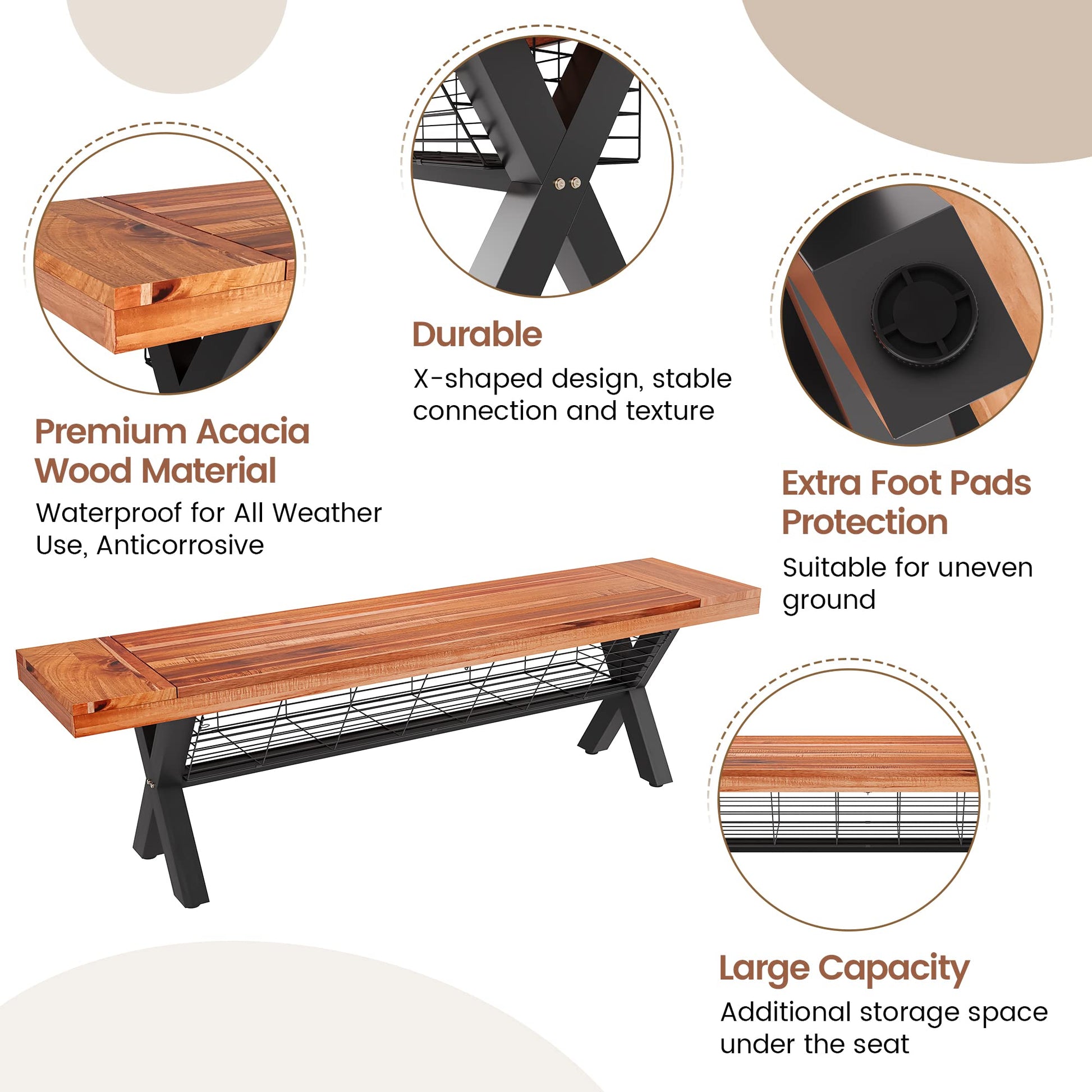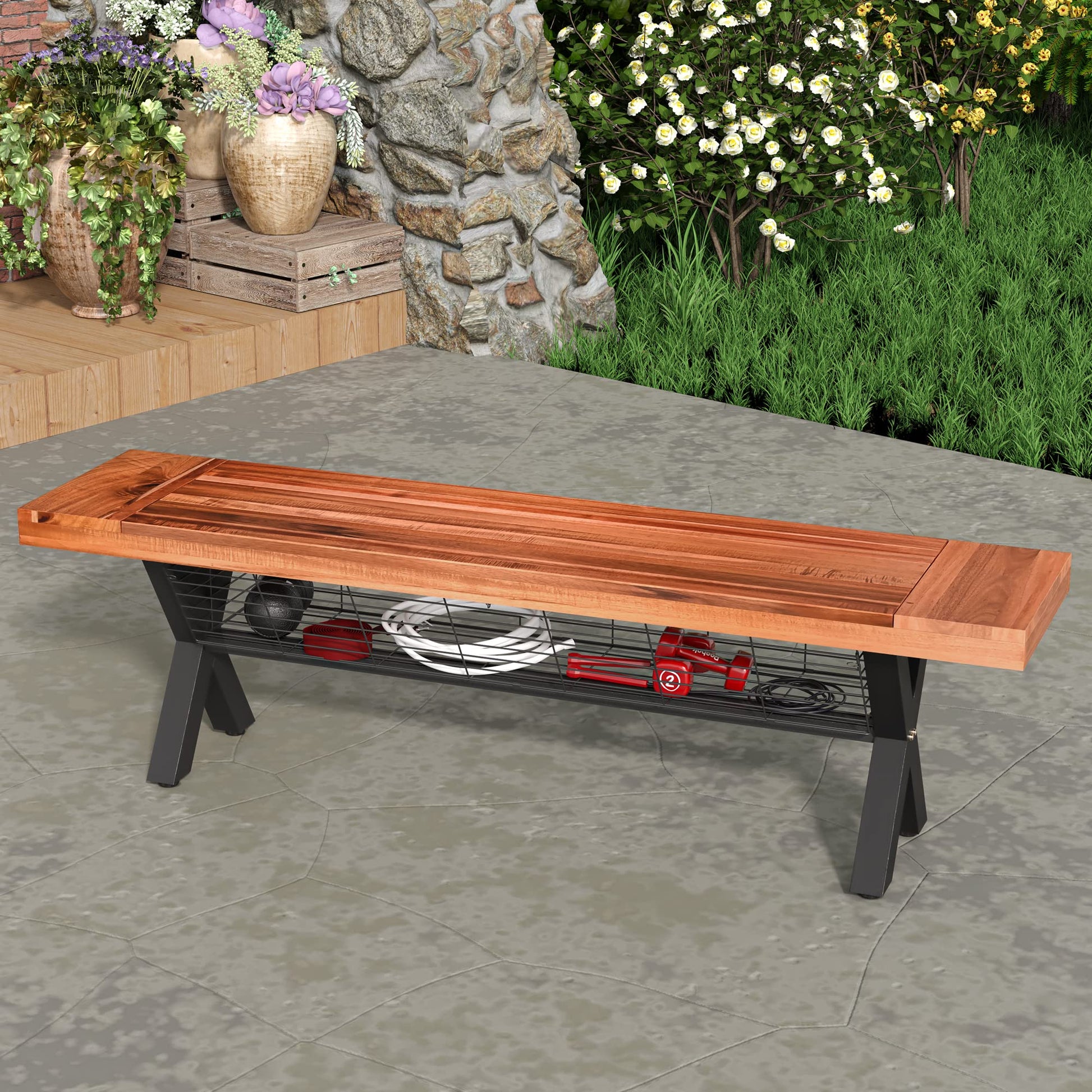 Garvee Outdoor Bench with Storage Basket, Outdoor Patio Acacia Wood Benches, Park Bench for Patio Porch, for Backyard, Garden, Lawn, Porch, Bedroom, Iron Feet, Teak Color