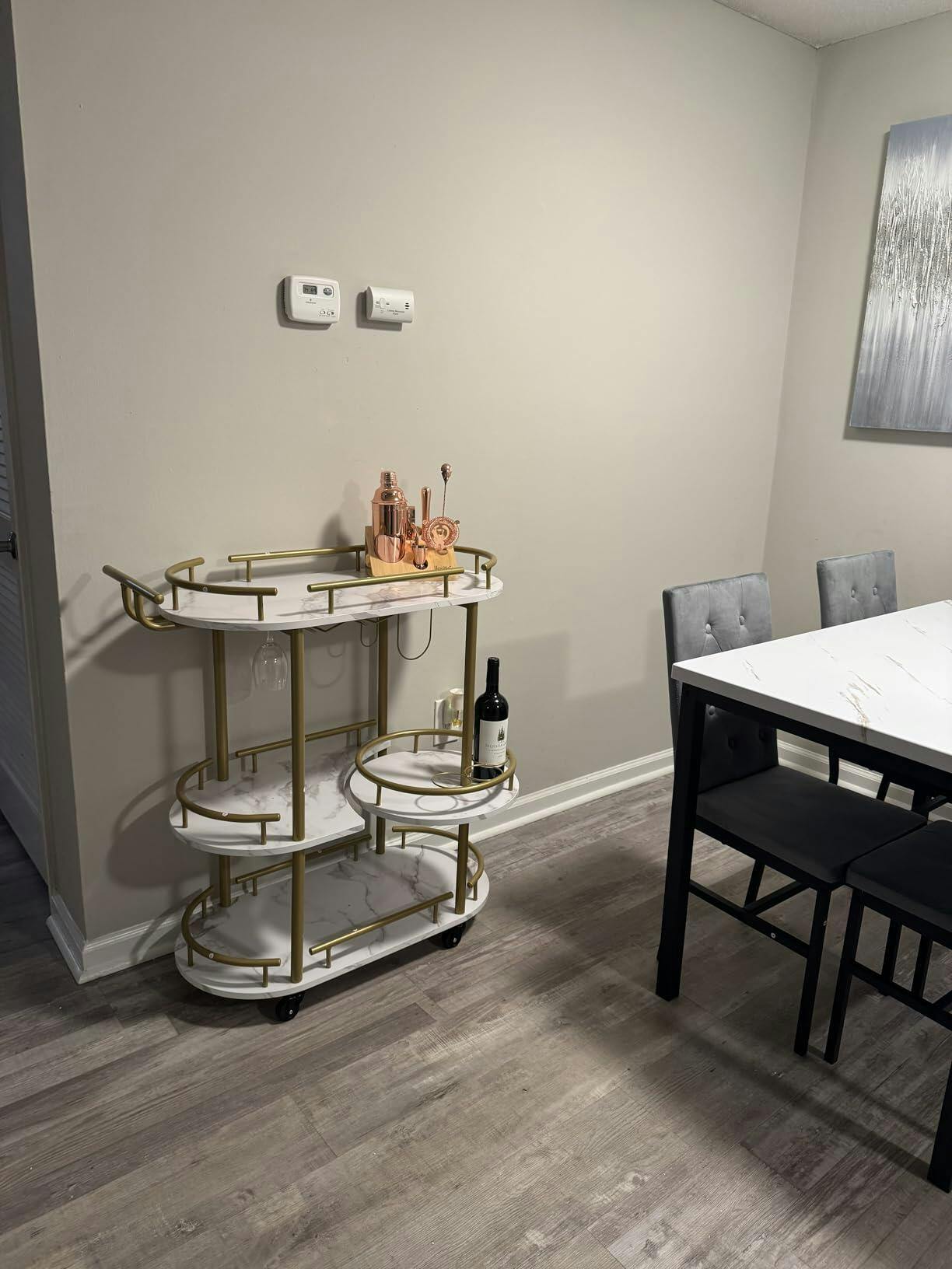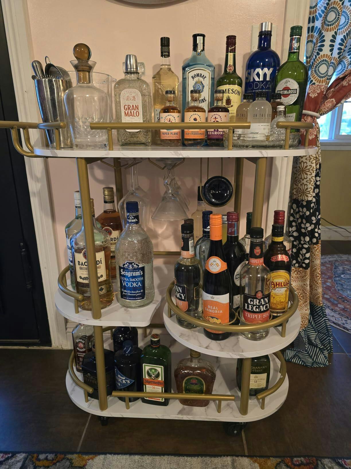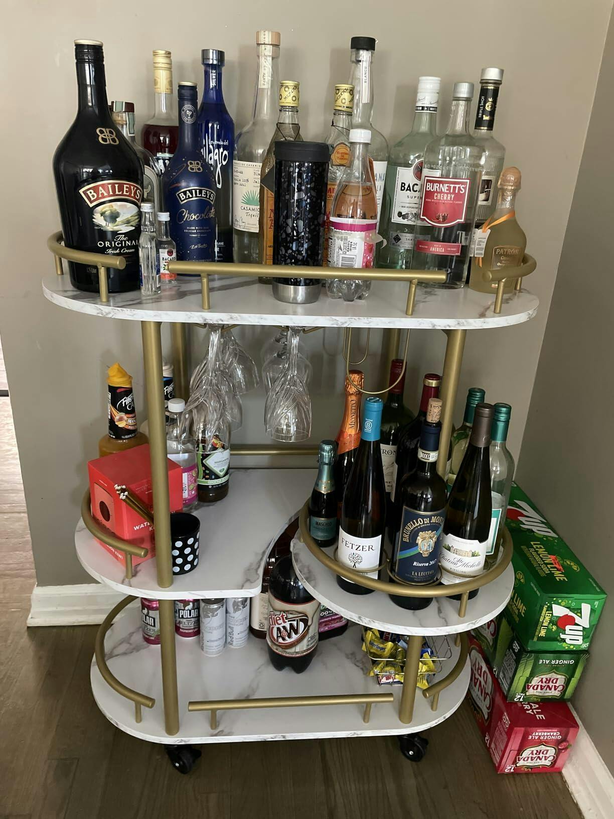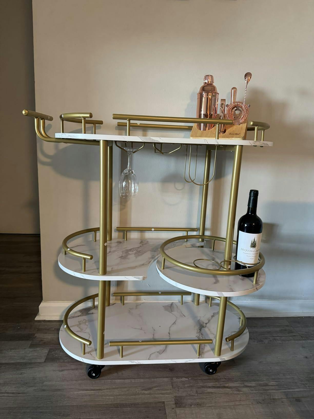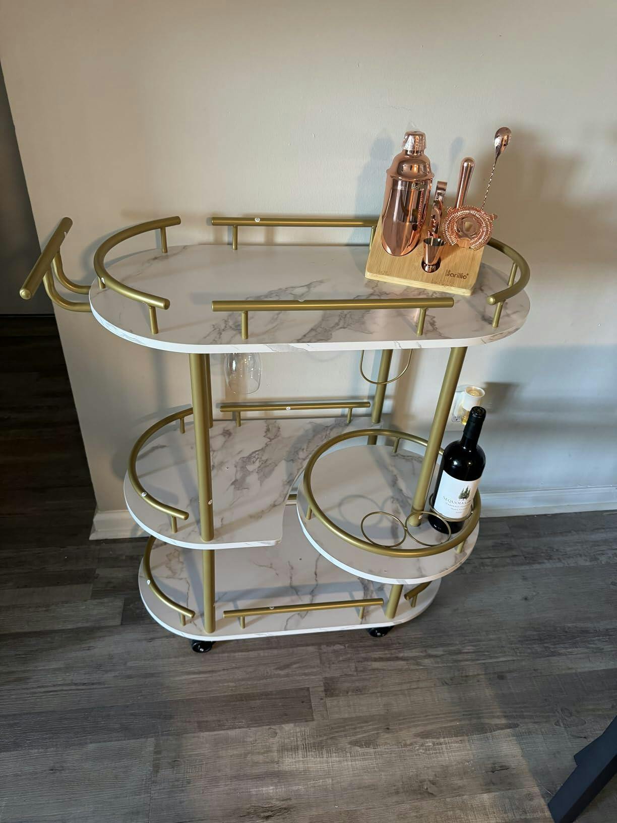 Garvee Gold Bar Cart 3 Tier with Wine Rack & Glass Holder, Rotating Turntable, Faux Marble, Lockable Wheels, Easy Assembly, for Living Room & Kitchen