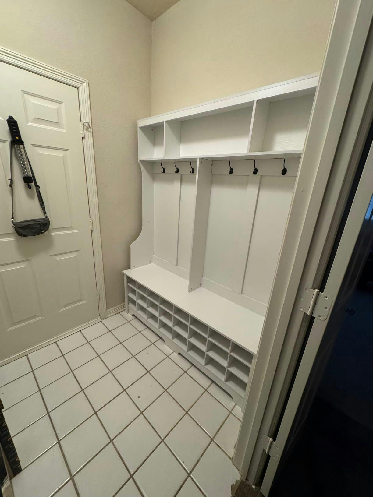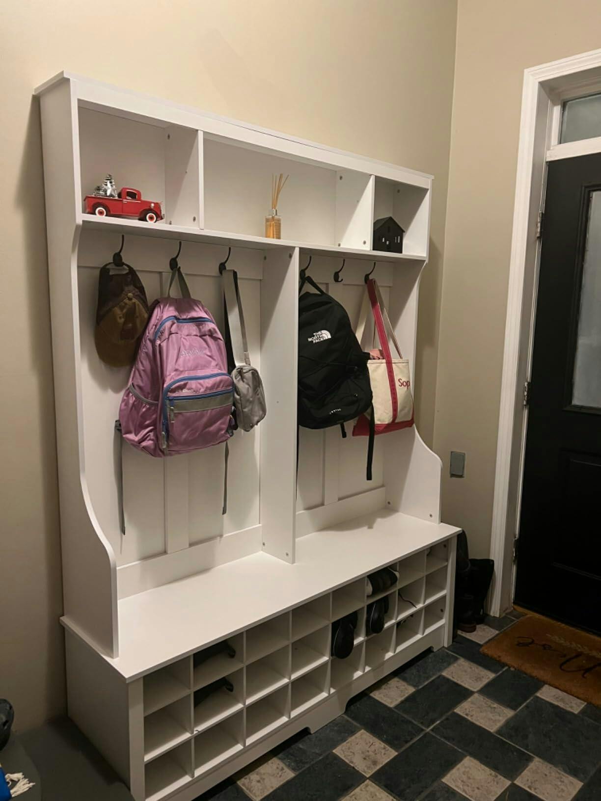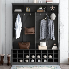 - --Multi functional design: Three upper compartments can accommodate large items of different sizes, and six metal hooks can hang your jacket, scarf, wallet, and hat. There are 24 separate shoe cabinets on the spacious bench