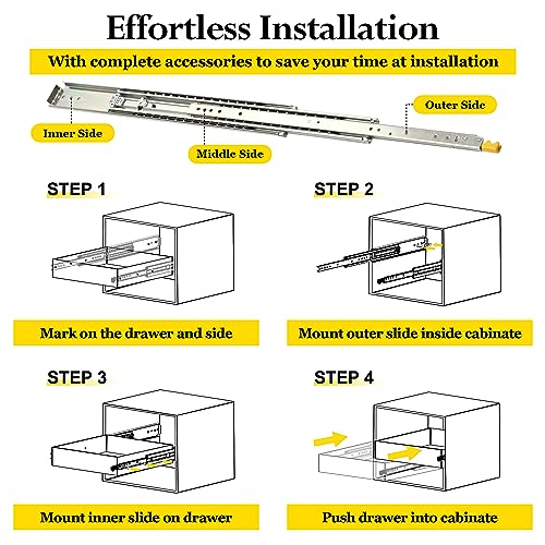 - ✅【Installation & Usage】These heavy-duty drawer slides can be easily installed on the side of the cabinet or machine parts. All necessary screws and bolts are included for effortless installation. heavy duty drawer slides are ideal for new construction, remodeling, and replacement projects, such as industrial drawers, commercial equipment, and retrofitted vehicles.