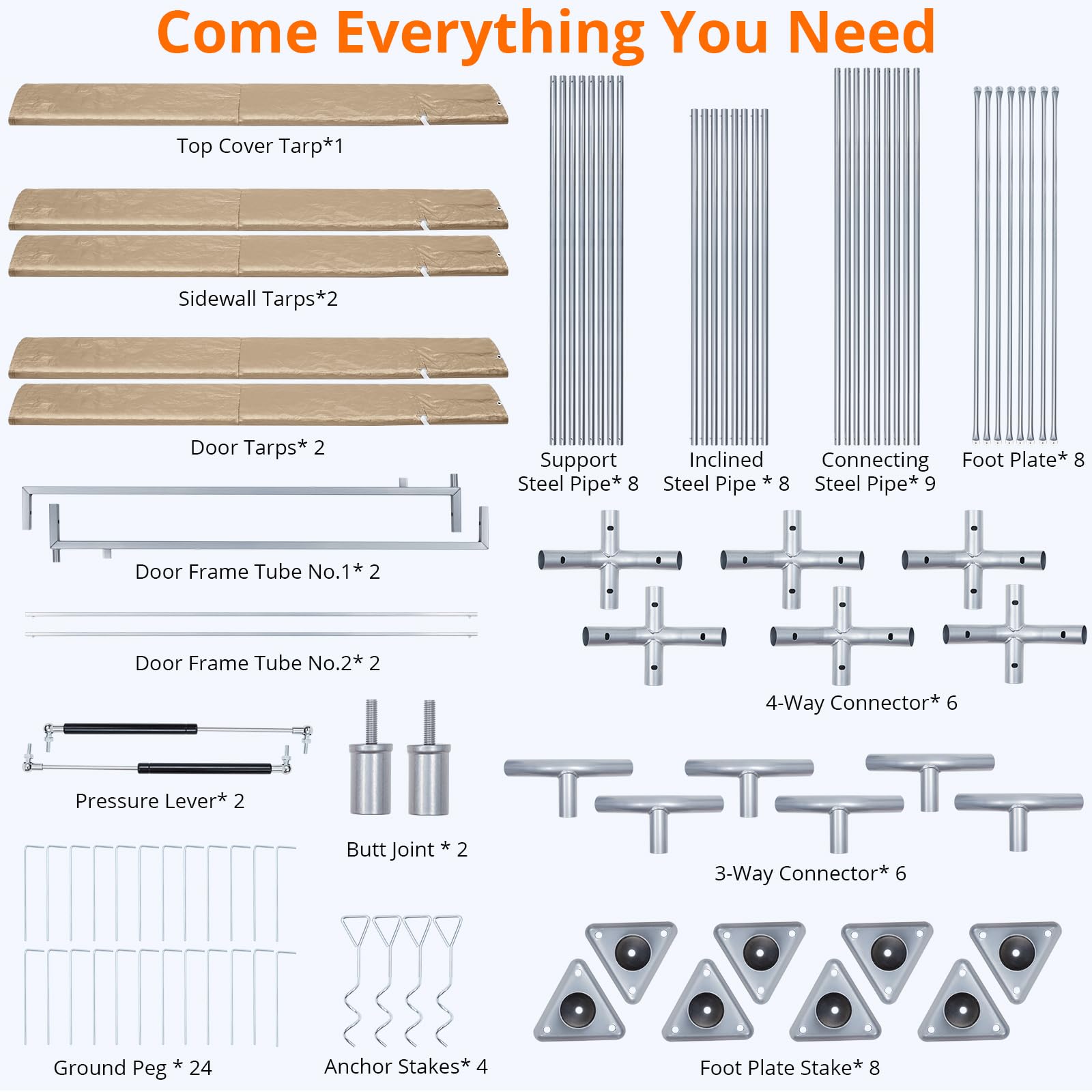 | Included Components | Top Cover Tarp*1, Removable Sidewall Tarps*2, Removable Zipper Doors * 2, Connecting Steel Pipe No.1 * 9, Support Steel Pipe No.2 * 8, Inclined Steel Pipe No.3 * 6, Reinforced Triangular Poles * 8, Foot Plate Stake * 8, 4-Way Connector * 6, 3-Way Connector * 6, Door Frame Tube No.1 * 2, Door Frame Tube No.2 * 2, Butt Joint * 2, Pressure Lever * 2, Anchor Stakes * 4, Ground Pegs * 24, Instruction Manual * 1 |